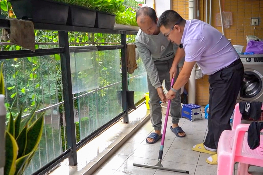 金成(右)教小舅子拖地,學(xué)習(xí)生活技能;葜萑?qǐng)?bào)記者陳濤 攝