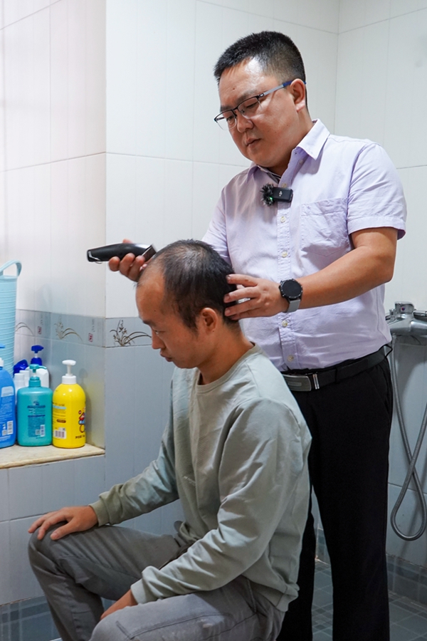 “頭發(fā)長了,該剪了!苯,記者來到金成的家里,他正爽朗地跟小舅子趙園園說著話,趙園園咧著嘴,配合著坐在浴室里,安靜地等著姐夫幫他剪頭發(fā)。今年33歲的趙園園看上去與正常人沒兩樣,面色紅潤、著裝干凈,看不出他是一個(gè)智力殘疾患者,而這,離不開“好姐夫”金成的悉心照護(hù)。