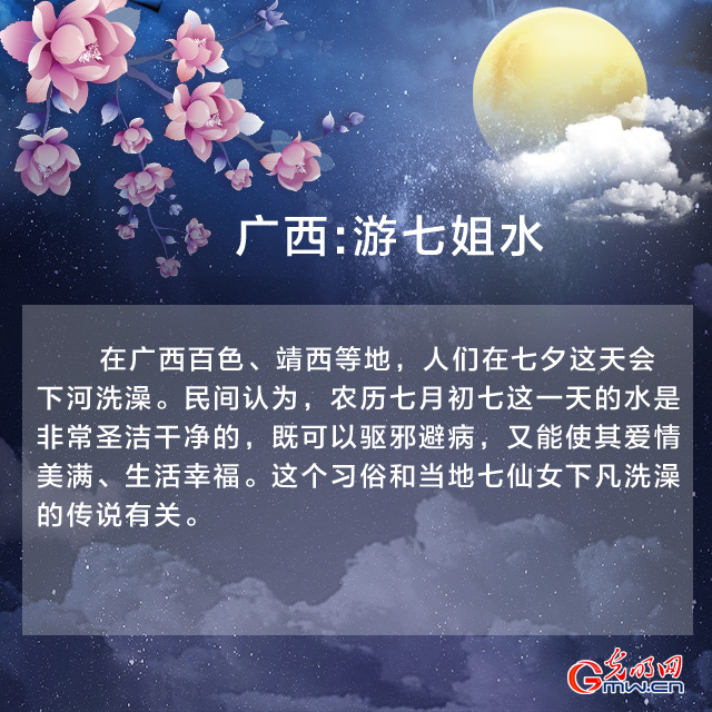 在廣西百色、靖西等地,人們?cè)谄呦@天會(huì)下河洗澡。民間認(rèn)為,農(nóng)歷七月初七這一天的水是非常圣潔干凈的,既可以驅(qū)邪避病,又能使其愛(ài)情美滿、生活幸福。這個(gè)習(xí)俗和當(dāng)?shù)仄呦膳路蚕丛璧膫髡f(shuō)有關(guān)。