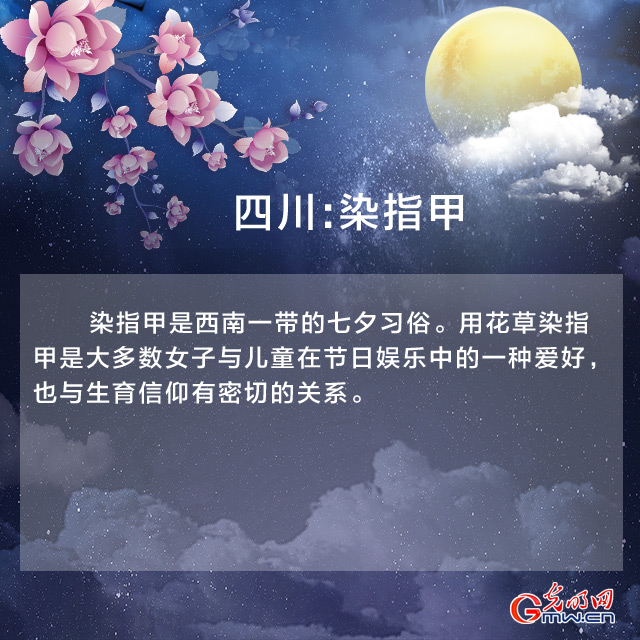 染指甲是西南一帶的七夕習(xí)俗。用花草染指甲是大多數(shù)女子與兒童們?cè)诠?jié)日娛樂(lè)中的一種愛(ài)好,也與生育信仰有密切的關(guān)系。