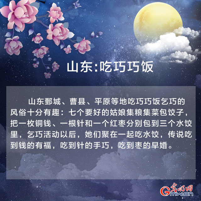 山東鄄城、曹縣、平原等地吃巧巧飯乞巧的風(fēng)俗十分有趣:七個(gè)要好的姑娘集糧集菜包餃子,把一枚銅錢(qián)、一根針和一個(gè)紅棗分別包到三個(gè)水餃里,乞巧活動(dòng)以后,她們聚在一起吃水餃,傳說(shuō)吃到錢(qián)的有福,吃到針的手巧,吃到棗的早婚。