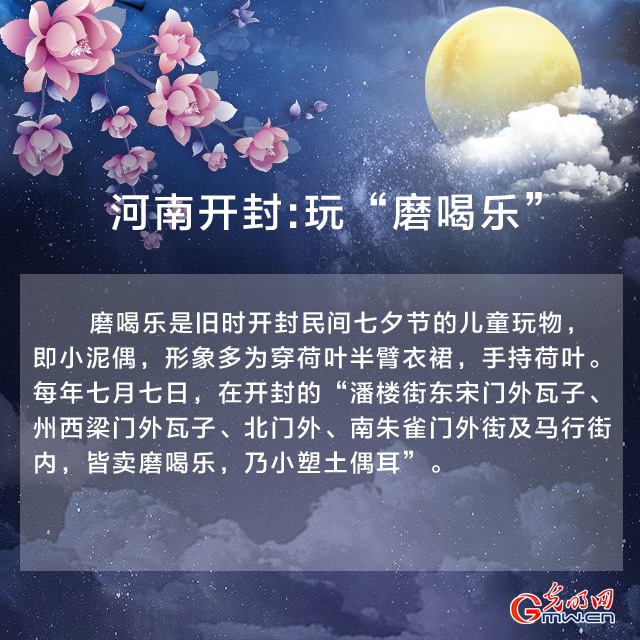 磨喝樂(lè)是舊時(shí)開(kāi)封民間七夕節(jié)的兒童玩物,即小泥偶,其形象多為穿荷葉半臂衣裙,手持荷葉。每年七月七日,在開(kāi)封的“潘樓街東宋門(mén)外瓦子、州西梁門(mén)外瓦子、北門(mén)外、南朱雀門(mén)外街及馬行街內(nèi),皆賣(mài)磨喝樂(lè),乃小塑土偶耳”。