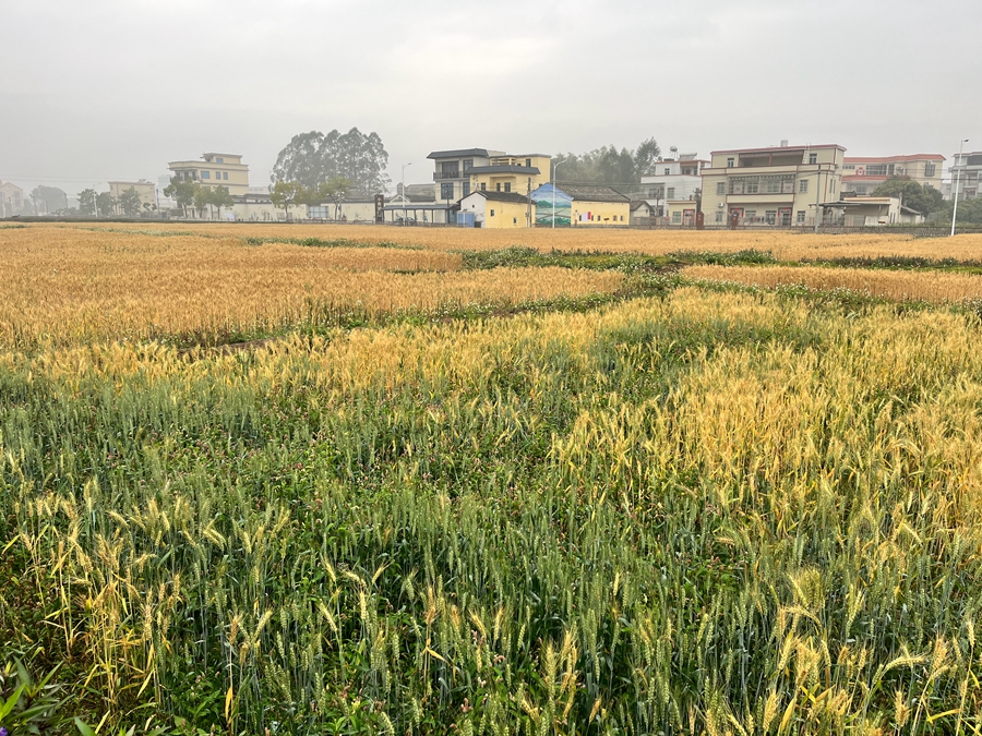 麥田與民居相得益彰。 惠州日報記者黃桃 通訊員馬麗娟 譚國強 攝