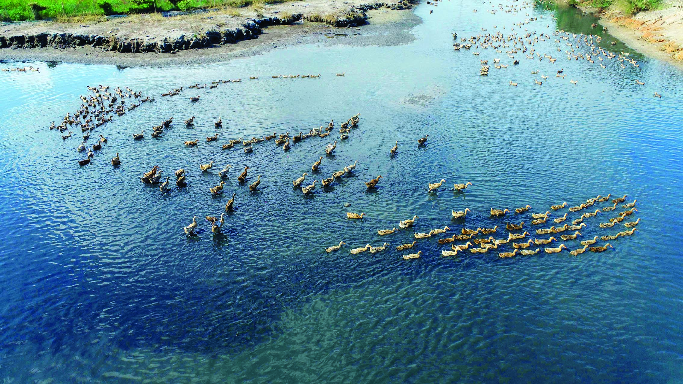 養(yǎng)殖的蛋鴨在惠東縣鐵涌鎮(zhèn)油麻地村的考洲洋河道上覓食。 惠州日報(bào)記者楊建業(yè) 攝