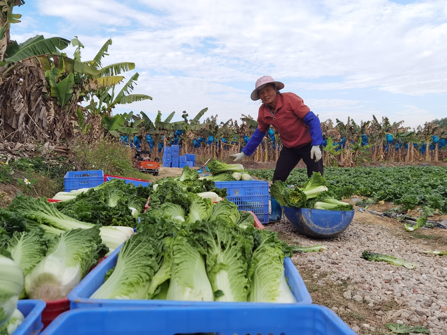 供銷農場的建設不僅壯大村集體經營性收入,還讓村民增收有了新路徑。蘇勝機說,以前,有些村民把土地散租給外地菜農,每畝每年租金才800元。而今,通過統(tǒng)一流轉租給供銷農場,每畝每年有1200元。同時,供銷農場在生產、收獲時,都會雇傭當?shù)卮迕,村民可以獲得勞動收入。目前,顯崗村的包菜正在上市,需要雇傭當?shù)卮迕裾恕D暧?0歲的黃阿姨就是其中之一。她說,到這里幫忙摘菜,每天能有130元收入。對于土地托管的農戶,供銷蔬菜專業(yè)合作社以土地托管的形式,給予每戶托管分紅2400元/年,社員承包地塊種植平均收益2800元/年。