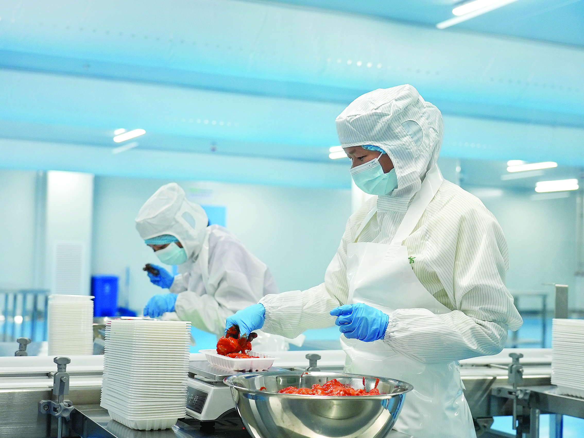 優(yōu)予食品生產車間內,員工在制作預制菜;葜萑請笥浾吖i 攝