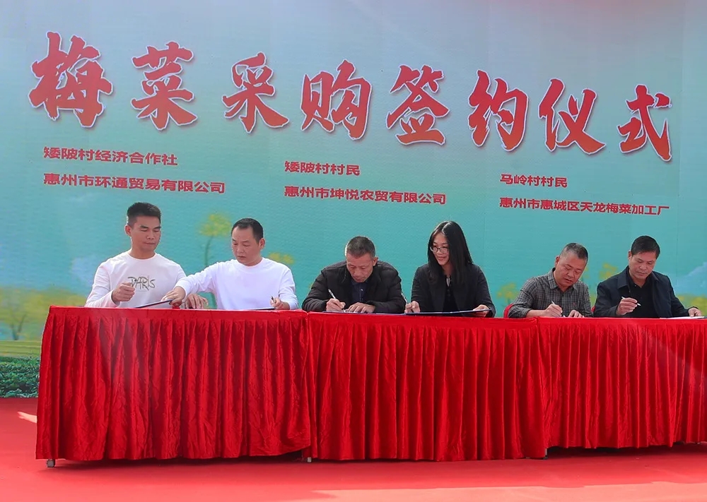產(chǎn)業(yè)的發(fā)展離不開產(chǎn)銷結(jié)合。活動(dòng)中,矮陂村經(jīng)濟(jì)合作社與惠州市環(huán)通貿(mào)易有限公司、矮陂村村民代表與惠州市坤悅農(nóng)貿(mào)有限公司、馬嶺村村民代表與惠州市惠城區(qū)天龍梅菜加工場分別簽訂梅菜采購協(xié)議,大力推動(dòng)種植戶與梅菜企業(yè)、農(nóng)民合作社與種植企業(yè)合作,進(jìn)一步保障梅菜品質(zhì),規(guī)范生產(chǎn)標(biāo)準(zhǔn),拓寬梅菜銷售渠道。