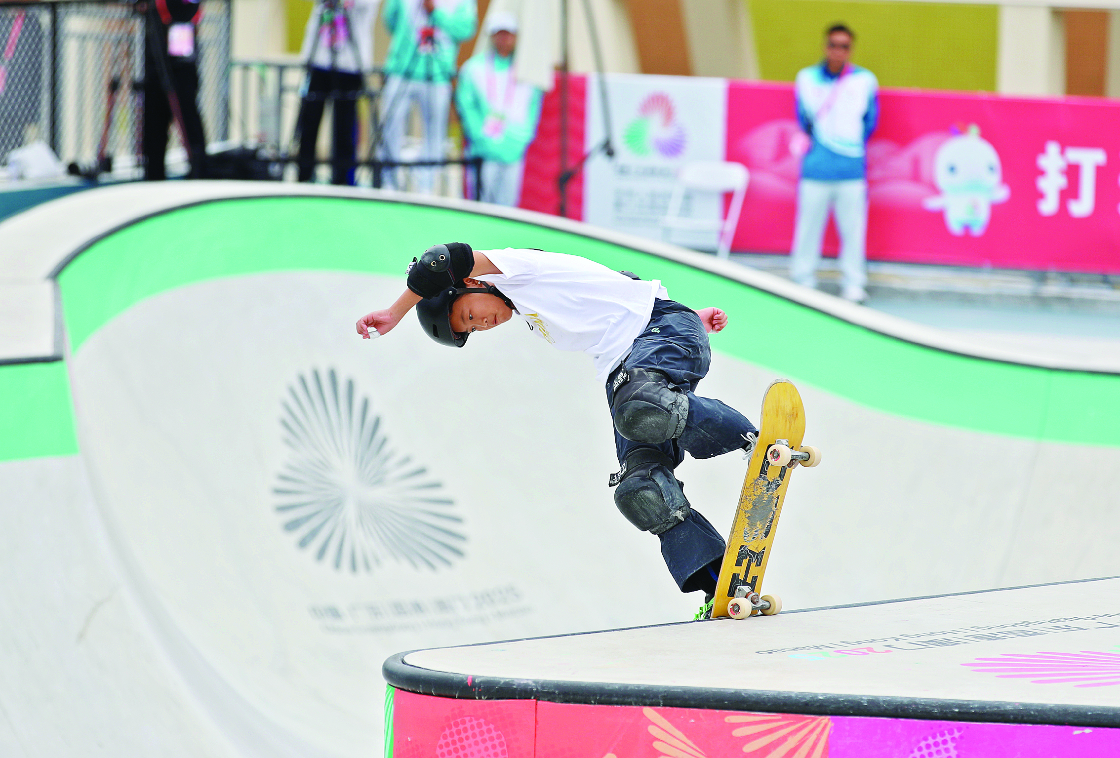“宋昂媞,加油!”“融融,快樂滑板,享受比賽!”“全力以赴,融耀賽場”……看臺上,10余人的親友團舉著標語、高聲吶喊,為場上年齡最小的選手——9歲零5個月的四川代表隊運動員宋昂媞助威。宋昂媞的爸爸介紹,女兒從6歲起接觸滑板,至今已堅持3年,這是他們第二次來廣東,“一踏入這座城市,就被濃厚的十五運會氛圍包裹著!彼锌,從機場的志愿者貼心指引入住路線、講解乘車攻略,到城市里隨處可見的賽事元素,都讓人倍感溫暖,“廣東的包容性和細致服務(wù),給我們留下了深刻印象。”談及賽后計劃,他笑著說,一家人要好好逛逛廣東,品嘗地道美食,感受嶺南風情。