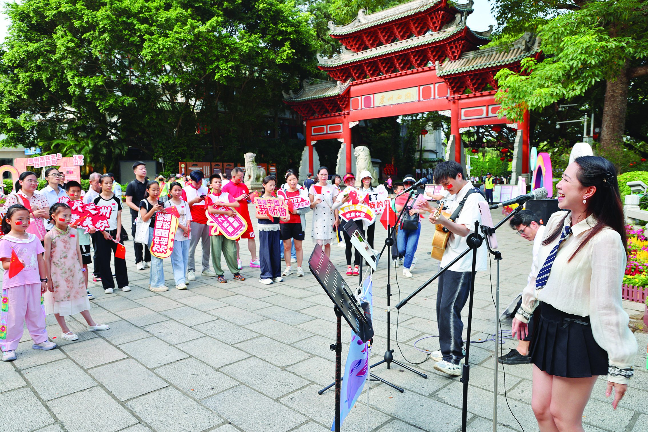 “我愛你中國!薄白W鎳湛鞓!”在吉他優(yōu)美弦樂中,參與快閃活動的市民游客還通過惠州日報視頻號直播鏡頭,向全國觀眾朋友大聲喊出節(jié)日問候,傳遞祝福。