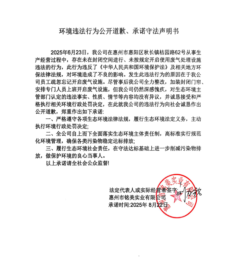 環(huán)境違法行為公開道歉、承諾守法聲明書