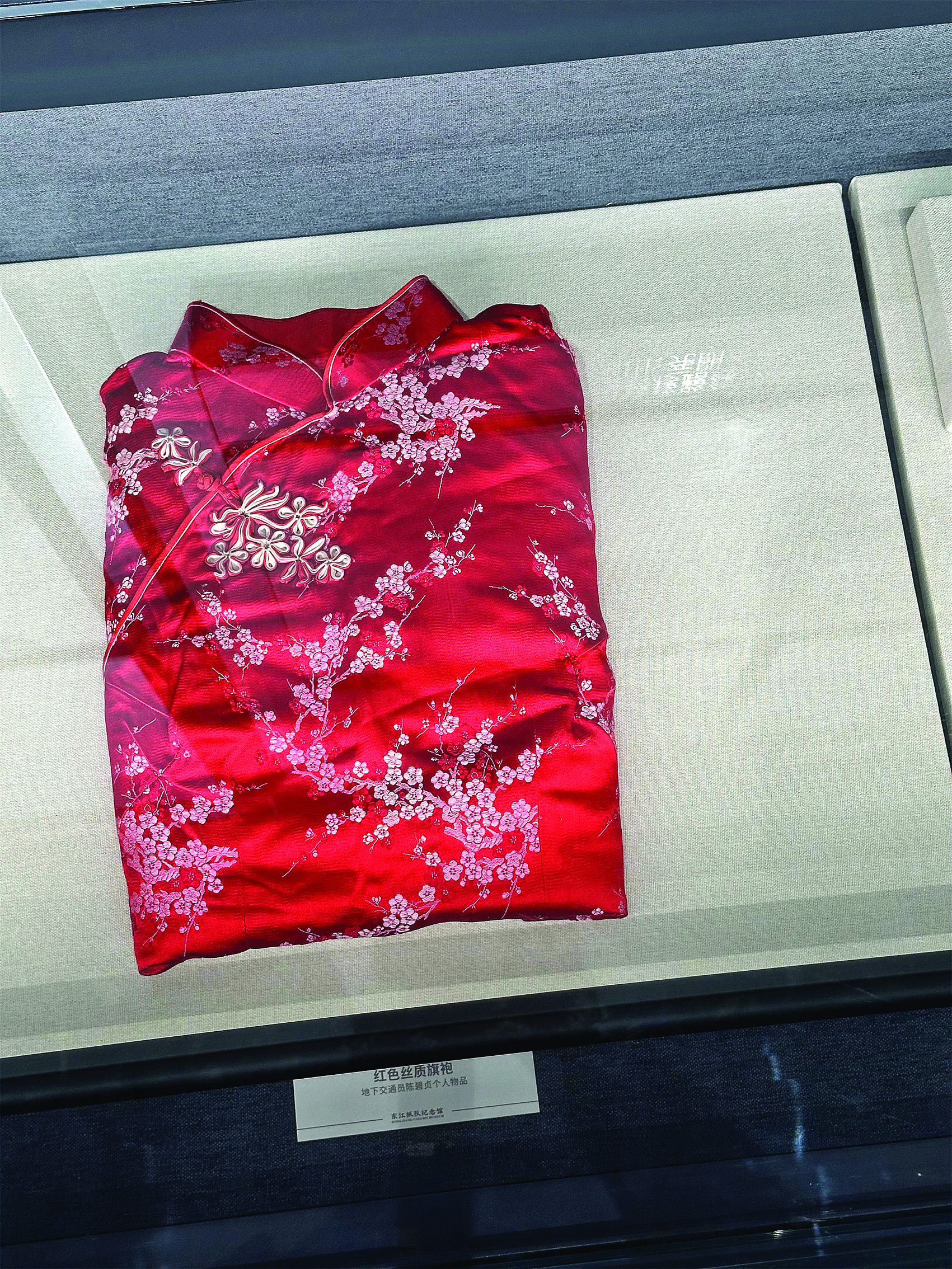 在館內(nèi)的展柜中,一襲紅色絲質(zhì)旗袍靜靜陳列。燈光透過玻璃灑在緞面上,熾烈的紅如同跳動的火焰,旗袍上朵朵梅花刺繡傲然綻放,輝映著東縱戰(zhàn)士堅定的革命信仰。在那個戰(zhàn)火紛飛的年代里,這不是普通的服飾,而是穿在戰(zhàn)士身上的“情報戰(zhàn)袍”。