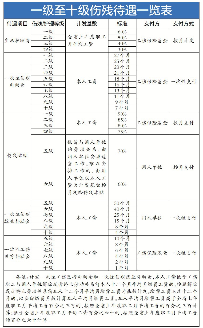 工傷傷殘職工除可享受工傷醫(yī)療費(fèi)、住院伙食補(bǔ)助費(fèi)報(bào)銷等工傷醫(yī)療待遇外,還可以按規(guī)定享受傷殘津貼、生活護(hù)理費(fèi)、一次性傷殘補(bǔ)助金、一次性工傷醫(yī)療補(bǔ)助金、一次性傷殘就業(yè)補(bǔ)助金等傷殘待遇(具體見《一級至十級傷殘待遇一覽表》)。