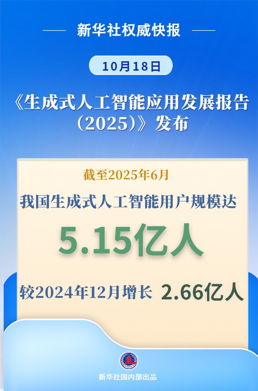 10月18日,中國(guó)互聯(lián)網(wǎng)絡(luò)信息中心在2025(第六屆)中國(guó)互聯(lián)網(wǎng)基礎(chǔ)資源大會(huì)上發(fā)布《生成式人工智能應(yīng)用發(fā)展報(bào)告(2025)》。報(bào)告顯示,截至2025年6月,我國(guó)生成式人工智能用戶規(guī)模達(dá)5.15億人,較2024年12月增長(zhǎng)2.66億人,用戶規(guī)模半年翻番;普及率為36.5%。