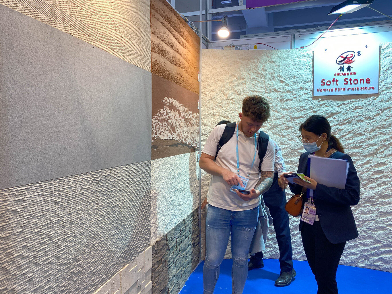 “我們等了三年,對(duì)本次廣交會(huì)順利開(kāi)幕,心情非常激動(dòng)!被葜菔袆(chuàng)鑫隆實(shí)業(yè)有限公司總經(jīng)理唐代全說(shuō),創(chuàng)鑫隆此次攜12款軟石新品全新亮相,而且基本都是有發(fā)明專(zhuān)利的產(chǎn)品,一經(jīng)展出,就受到眾多海內(nèi)外客戶關(guān)注。他表示,軟石是一種新型建筑材料,兼顧軟硬特性,還能像毯子那樣包卷,所以一定要在線下展用手觸摸,才能真切感受體驗(yàn)到其特性。“疫情三年,我們的外貿(mào)額下跌較大,今年形勢(shì)好轉(zhuǎn),如果能回升到疫情前80%的水平,我們會(huì)很高興。”