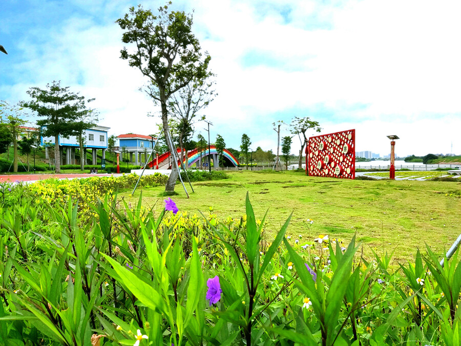 在紅旗二路,綻放的鮮花為道路增添了色彩;在東坡公園,錯落有序的樹木與彩虹橋互相映襯;在沙河旁,清盈盈的河水與岸邊的花草相得益彰......一幅幅美麗的畫面,勾勒出綠美石灣的夏日風景圖。