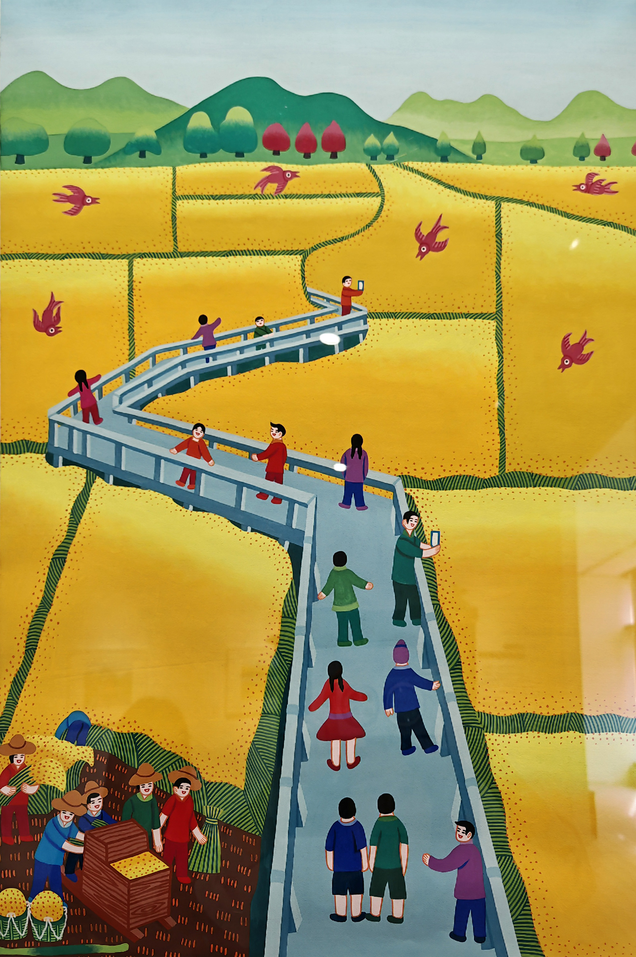 畫(huà)面里,金黃的田園廣袤如毯,蜿蜒的觀(guān)景步道串聯(lián)起詩(shī)意與煙火:游人們或漫步賞景、或定格美好,在田園風(fēng)光中盡享愜意;左下角的農(nóng)民們忙于豐收勞作,顆粒歸倉(cāng)的場(chǎng)景滿(mǎn)是農(nóng)耕的踏實(shí)與溫暖。