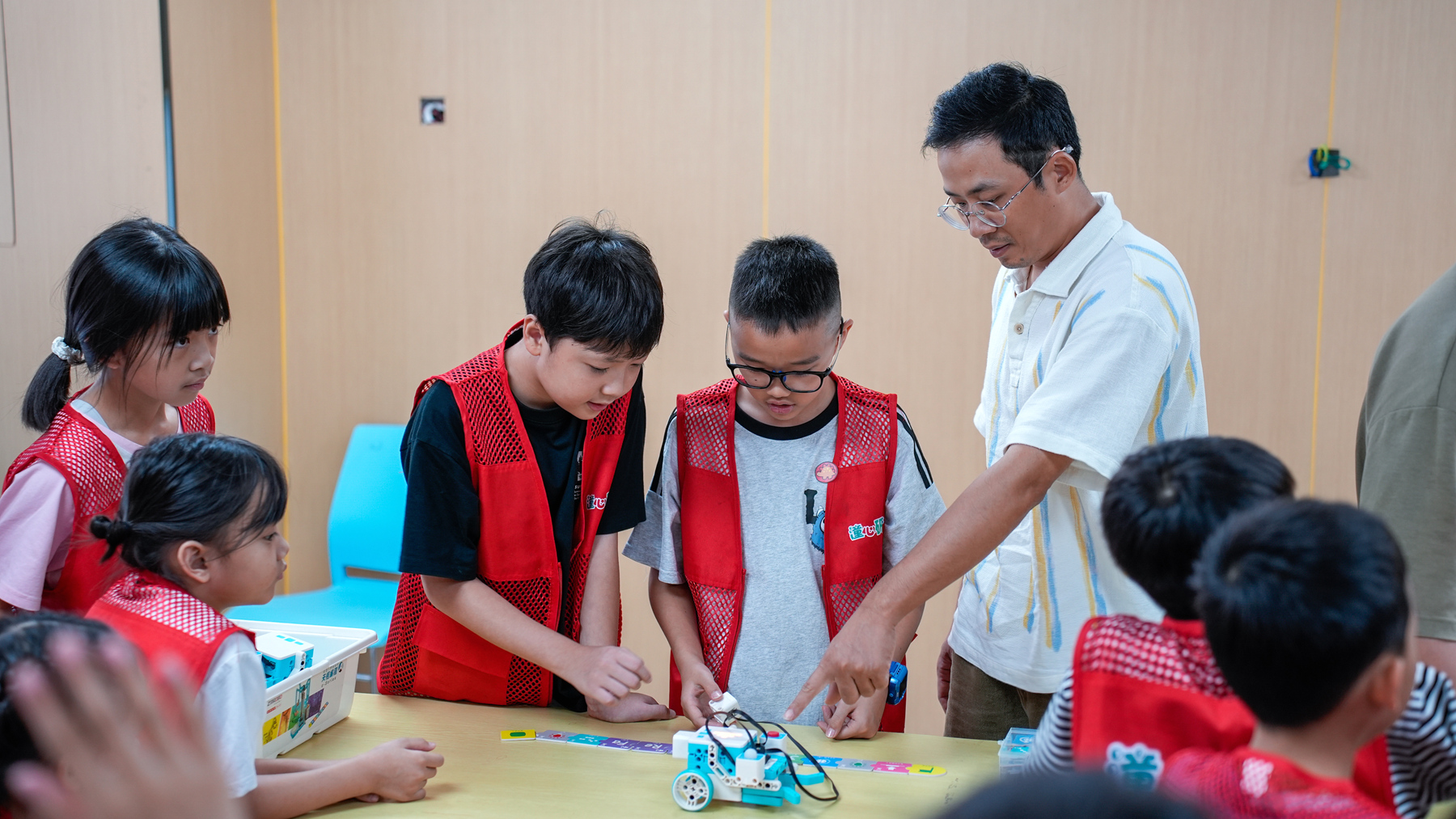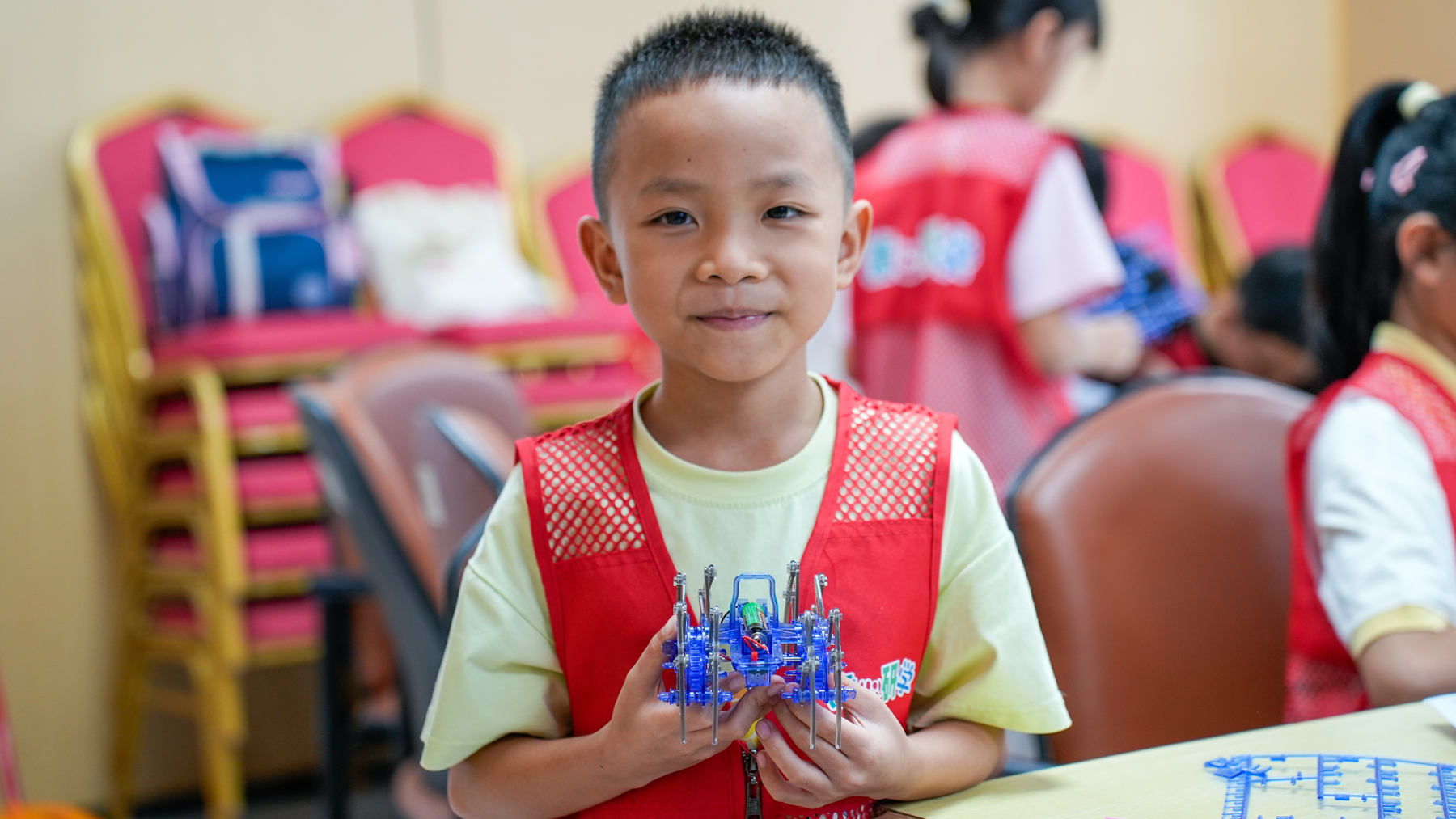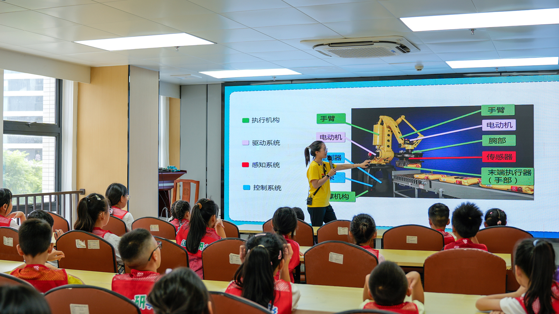 剛到達(dá)活動(dòng)營地——中韓(惠州)產(chǎn)業(yè)園起步區(qū)黨群服務(wù)中心,孩子們就走進(jìn)了機(jī)器人的知識(shí)世界。在這里,他們從了解機(jī)器人的驅(qū)動(dòng)、感知、控制系統(tǒng)到認(rèn)識(shí)手臂、電動(dòng)機(jī)、傳感器等零部件,以及在醫(yī)療、工業(yè)、運(yùn)輸?shù)榷鄠(gè)領(lǐng)域的神奇應(yīng)用,心中的好奇被瞬間點(diǎn)燃。通過趣味實(shí)踐,孩子們親眼見證這些“法寶”如何讓機(jī)器人擁有“看”和“聽”的能力,原本抽象的科學(xué)原理瞬間變得生動(dòng)易懂。