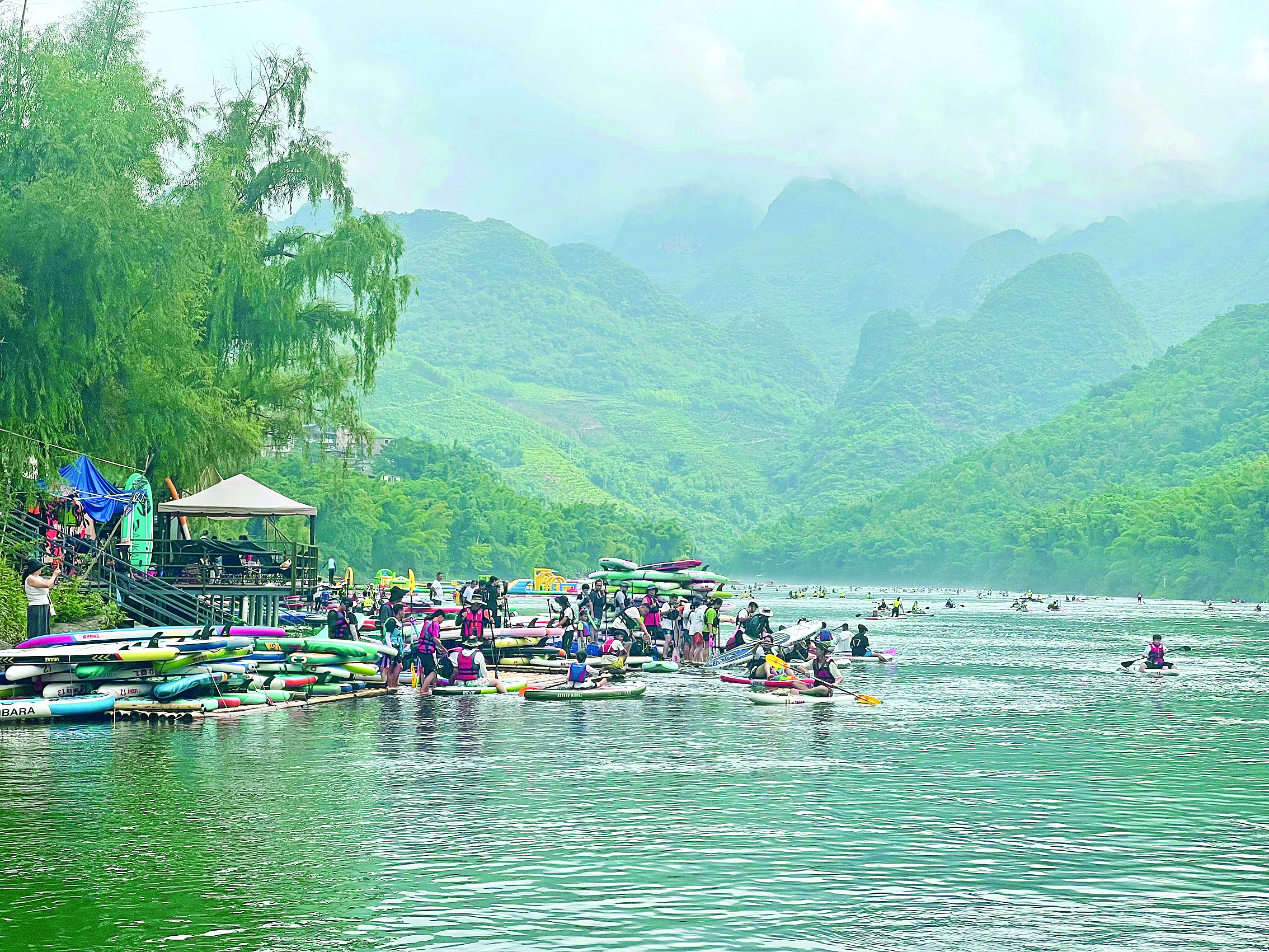 “加油!加油!加油……”去年夏天,2024年中國百城槳板公開賽(安龍站)在此開賽,來自廣東、上海等地的120余名槳板選手在南盤江上競技,吸引游客關(guān)注,“壩爾代夫”的美名隨賽事傳遍網(wǎng)絡(luò)。自公開賽在壩盤村舉辦后,這里便成為了槳板愛好者的樂園。游客量平日有約3000人,周末高峰時(shí)段高達(dá)4000余人,勞動節(jié)、國慶節(jié)假期每天多達(dá)1.7萬人!皣鴳c假期,僅槳板運(yùn)動項(xiàng)目就給村集體經(jīng)濟(jì)增加12萬元收入!比f峰湖鎮(zhèn)壩盤村黨支部書記、村委會主任陳啟仁說。