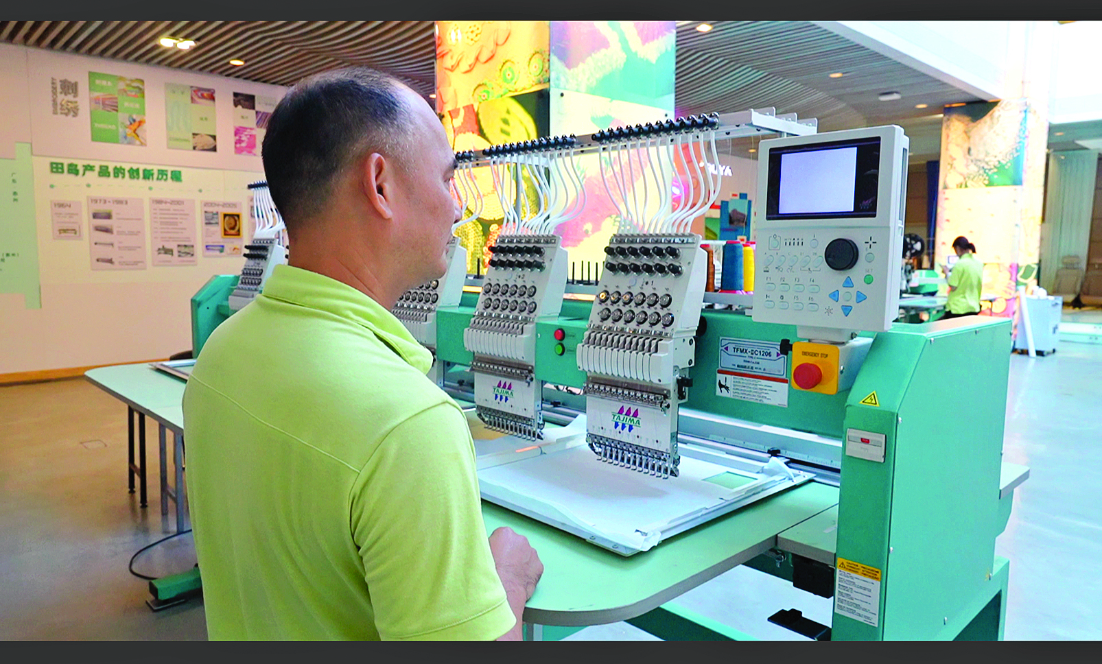工作人員通過操作面板控制刺繡機(jī)。