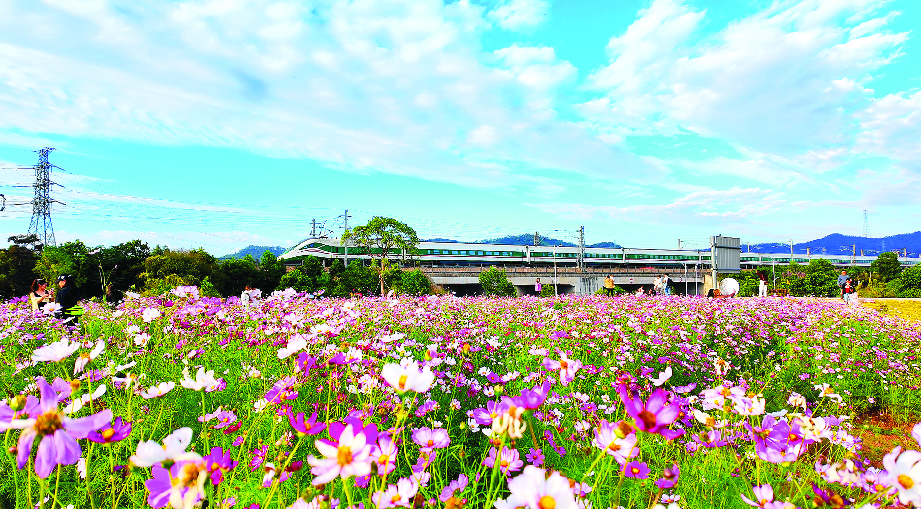 初冬的仲愷高新區(qū)陳江街道,暖陽為大地鍍上金邊。綠美黨建林內(nèi),粉白紫三色格;ㄤ佌钩衫寺ê,不遠(yuǎn)處京九鐵路列車呼嘯而過,與藍(lán)天白云、花海人群共同定格成一幅動靜相宜的城市生態(tài)畫卷。