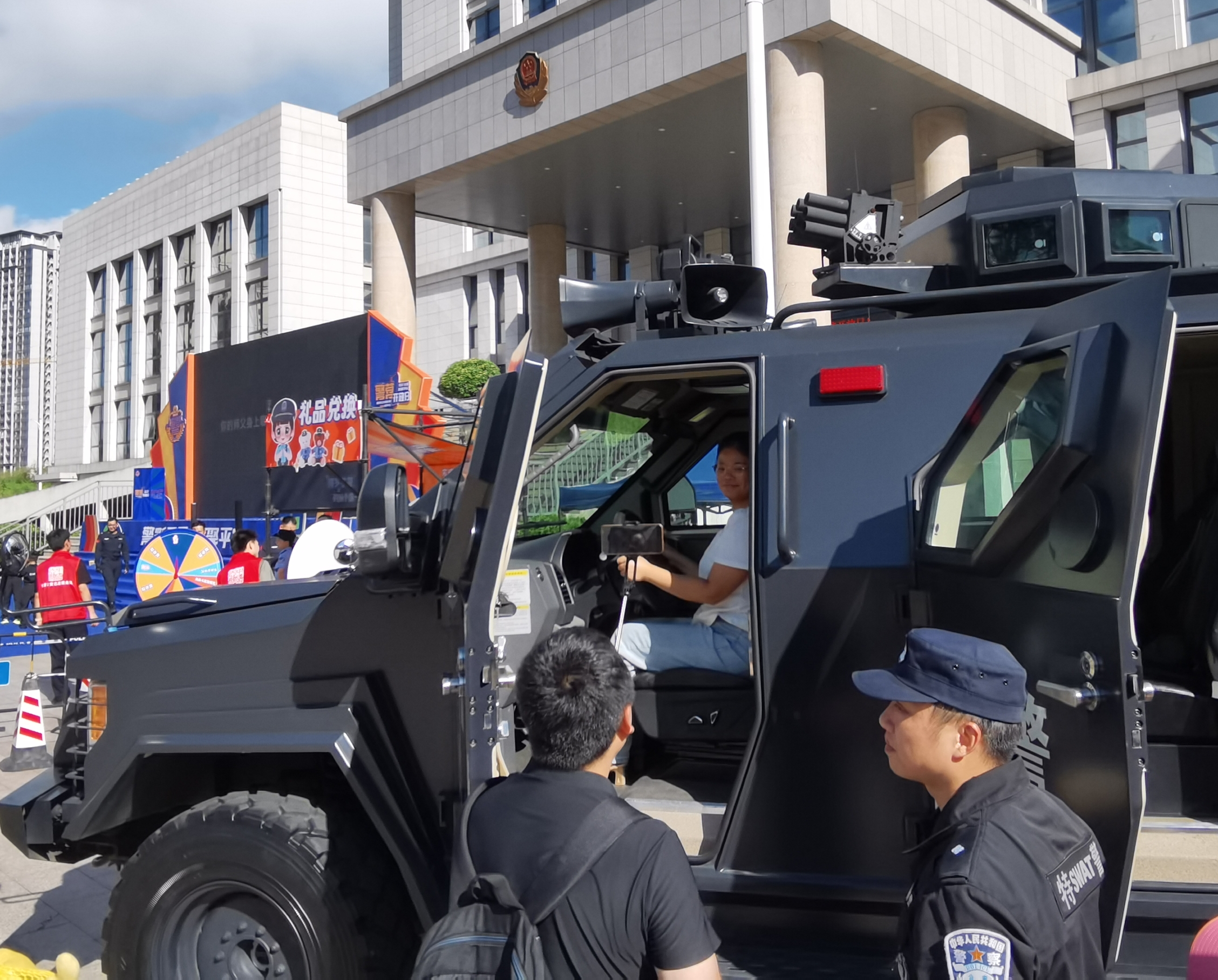 裝備展示區(qū)更成了群眾“零距離”接觸警務(wù)裝備的“科普課堂”。警員們細(xì)致地向群眾講解了盾牌、戰(zhàn)盔、防毒面具、防彈衣等警用裝備的功能及使用規(guī)范;炫酷的警用摩托車(chē)、威武的裝甲車(chē)等裝備一字排開(kāi),成為現(xiàn)場(chǎng)的“網(wǎng)紅打卡點(diǎn)”。小朋友們爭(zhēng)相爬上裝備參觀,眼神里滿(mǎn)是向往,家長(zhǎng)們則舉著手機(jī)記錄精彩瞬間。通過(guò)“看得見(jiàn)、摸得著、問(wèn)得清”的互動(dòng),群眾既認(rèn)識(shí)到警用裝備的嚴(yán)肅性,更真切體會(huì)到警察守護(hù)平安沉甸甸的責(zé)任感。