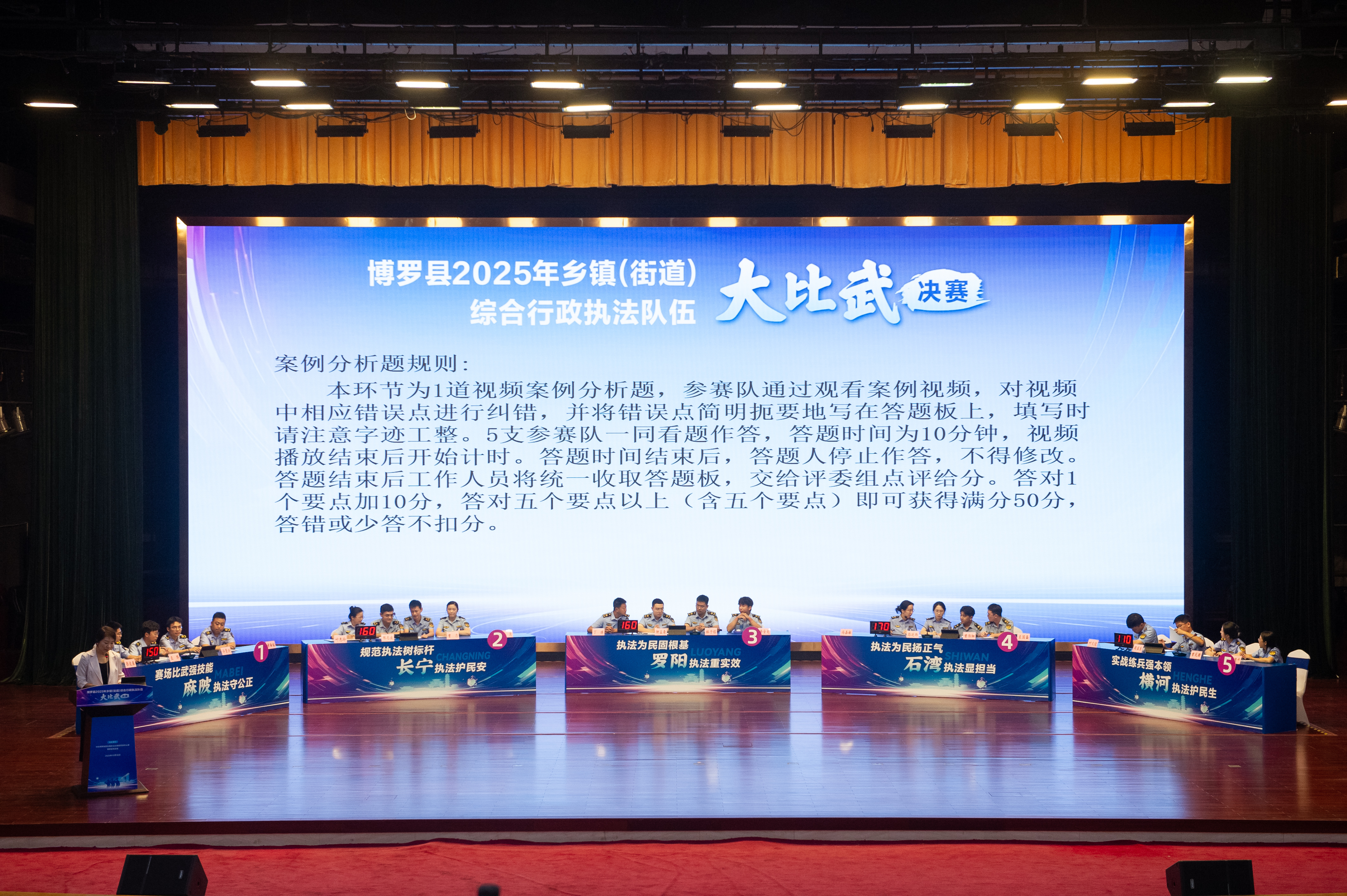 惠州日?qǐng)?bào)訊 (記者盧泓宇 通訊員楊小青 陳琳 張璐雨)日前,博羅縣2025年鄉(xiāng)鎮(zhèn)(街道)綜合行政執(zhí)法隊(duì)伍“大比武”決賽在縣文化中心舉行。從初賽中脫穎而出的麻陂鎮(zhèn)、長(zhǎng)寧鎮(zhèn)、羅陽(yáng)街道、石灣鎮(zhèn)、橫河鎮(zhèn)5支“執(zhí)法勁旅”齊聚一堂,圍繞“理論+實(shí)務(wù)”展開綜合較量,全面展現(xiàn)了專業(yè)素養(yǎng)與過硬本領(lǐng),生動(dòng)詮釋了新時(shí)代基層執(zhí)法隊(duì)伍的責(zé)任與擔(dān)當(dāng)。