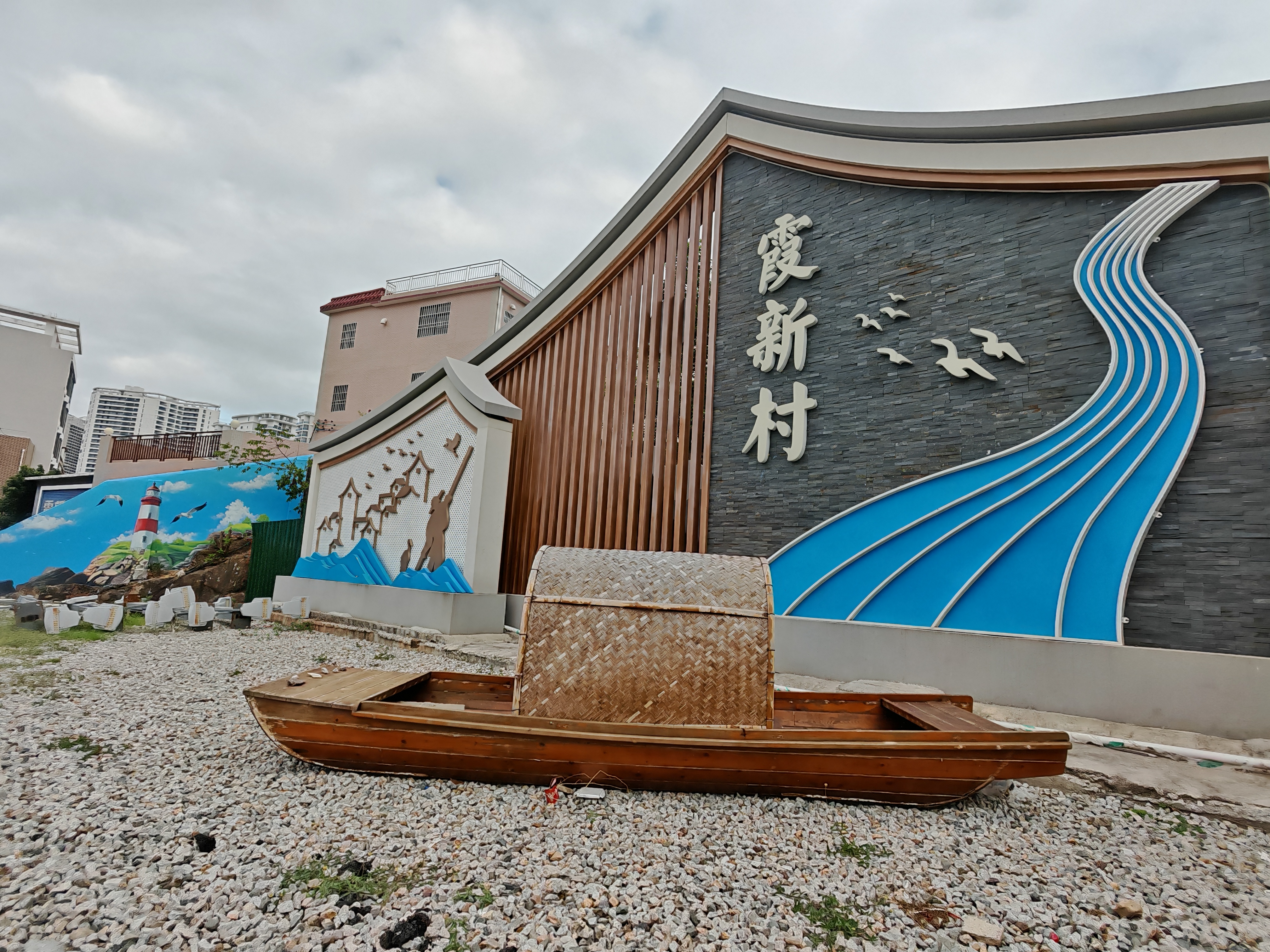 沿著海韻廣場(chǎng)穿過(guò)霞新橋,霞新村螺島下的入口處率先帶來(lái)驚喜。這里新添了一處醒目的村莊標(biāo)識(shí),整體風(fēng)格以藍(lán)白灰黃為主色調(diào),旁邊的山墻則巧妙畫上了漁村特色墻繪——燈塔矗立、海鳥(niǎo)翩飛,F(xiàn)場(chǎng)還特意擺放了一艘漁船模型,與墻體彩繪相映成趣,還原了傳統(tǒng)漁村的質(zhì)樸風(fēng)貌。而旁邊的登山步道則被巧妙設(shè)計(jì)成鋼琴鍵造型,搭配“好好生活、慢慢遇見(jiàn)”“喜歡你的,就叫你霞涌”等暖心文案,讓每一步前行都充滿儀式感。