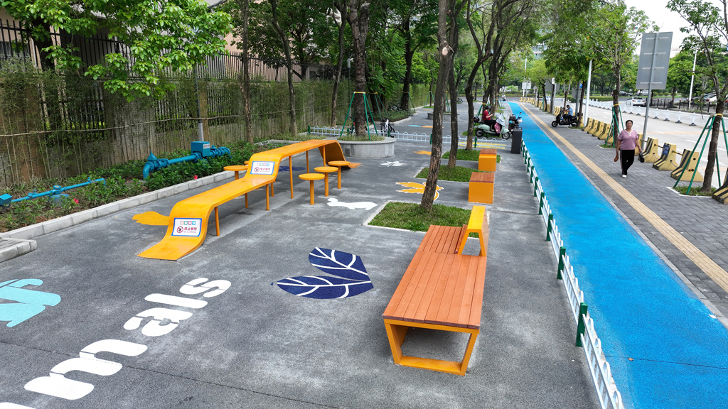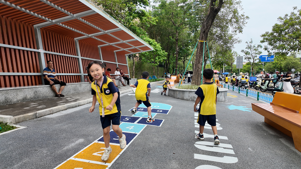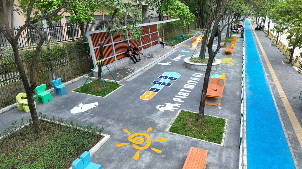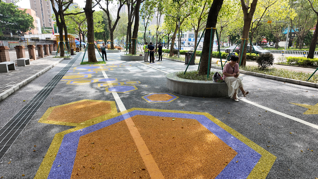 景觀煥新,充滿童趣:地面繪制的六邊形、五角星及太空星球圖案仿佛躍動(dòng)的音符,勾勒出一處激發(fā)想象力的游戲樂園。陽光透過廊架及枝葉灑下斑駁光影,整片綠地宛如一幅現(xiàn)代與自然交融的生動(dòng)畫卷。