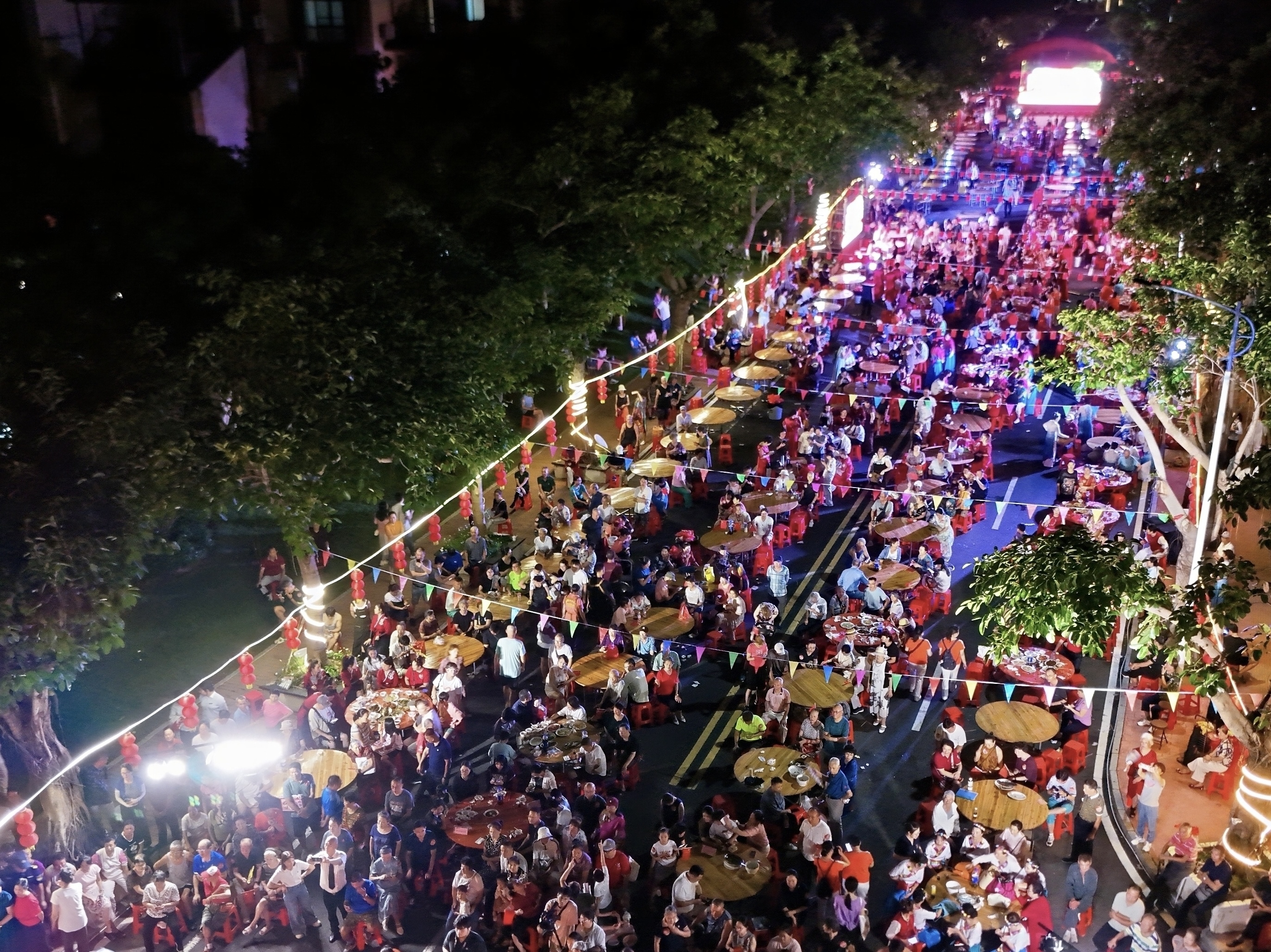 家宴現(xiàn)場,150張餐桌整齊排列,形成一道壯觀的社區(qū)風(fēng)景線。居民們自帶拿手好菜,分享各自家鄉(xiāng)的節(jié)日美食,展現(xiàn)了“百家宴”的傳統(tǒng)魅力。