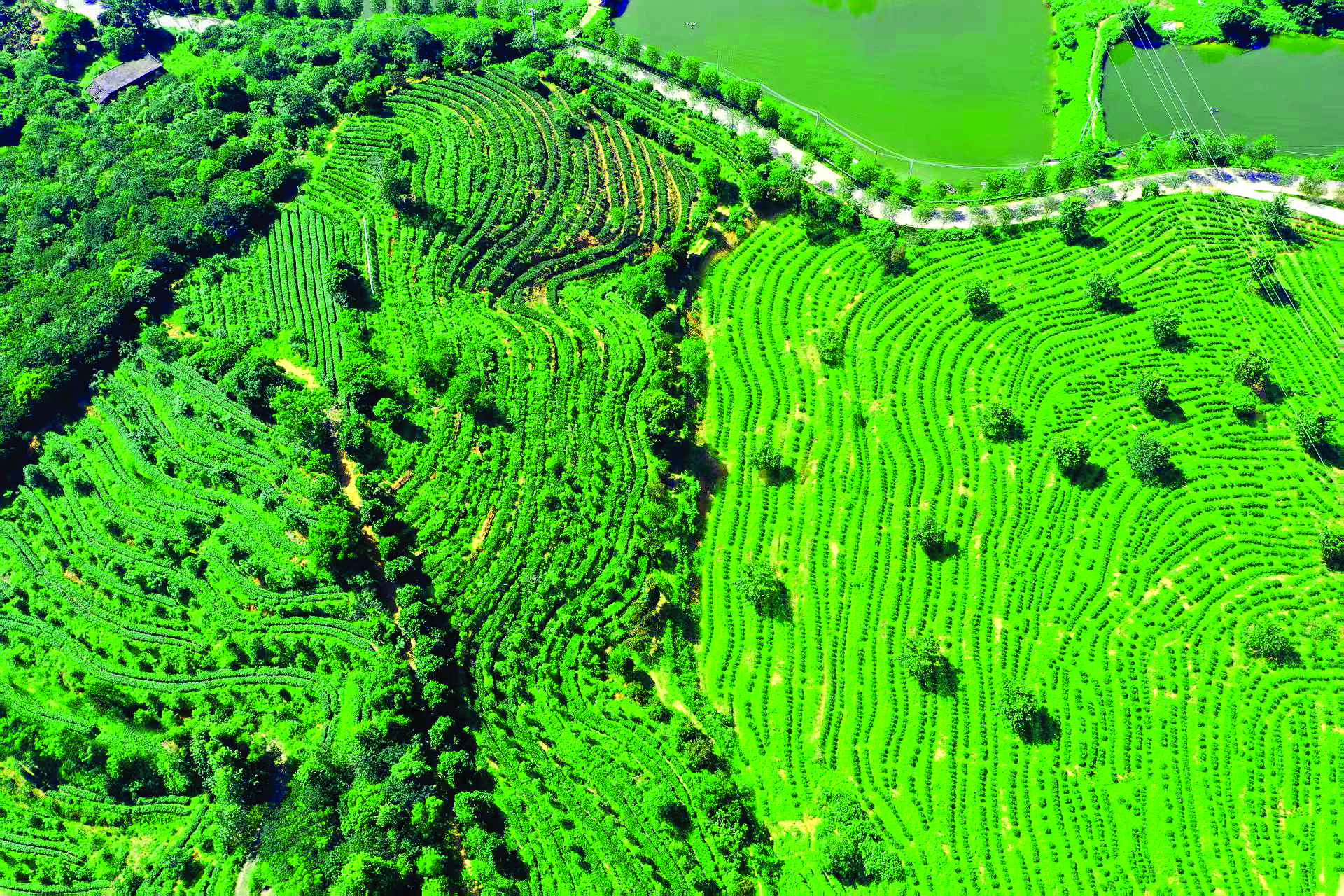 惠東生態(tài)茶園,從空中俯瞰,如妙手精心織就的綠色錦緞。層層疊疊的茶樹順著山勢(shì)蜿蜒起伏,線條流暢且富有韻律,似綠色的波浪在山間涌動(dòng)。