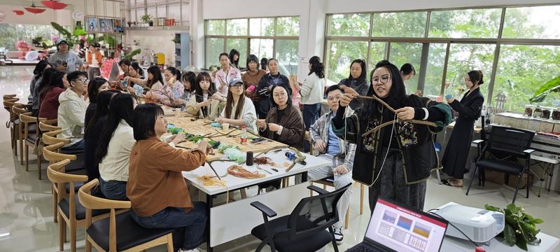 活動中,深圳職業(yè)技術(shù)大學(xué)博士蔣濤深入淺出地講解了纖維藝術(shù)的3種核心基本技法,并針對每位教師的創(chuàng)作思路進(jìn)行“一對一”指導(dǎo)。從材料選擇、色彩搭配到技法運(yùn)用,教師們在沉浸式學(xué)習(xí)中,最終完成了一件件風(fēng)格各異、創(chuàng)意十足的藝術(shù)作品。