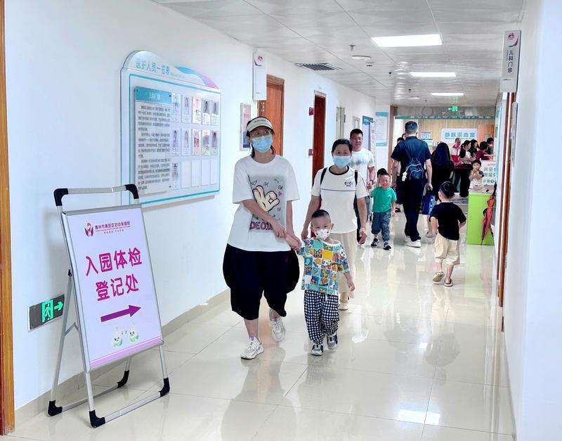 家長帶孩子到區(qū)兒童醫(yī)院進行入學前體檢。