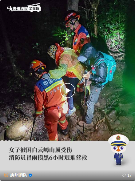 2025年10月22日下午,惠陽(yáng)區(qū)新圩鎮(zhèn)白云嶂山頂發(fā)生一起緊急救援事件。一名女性登山愛好者因腳踝扭傷被困山頂,無(wú)法自行下山。新圩鎮(zhèn)專職消防隊(duì)接警后迅速響應(yīng),歷經(jīng)近6小時(shí)徒步救援,最終成功將被困女子轉(zhuǎn)移至安全地帶。