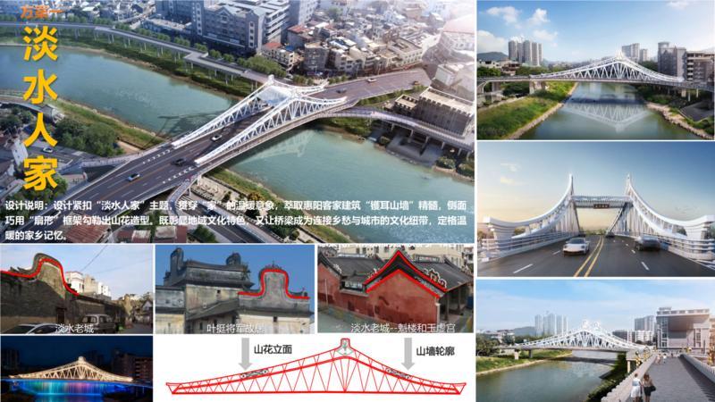 設(shè)計說明:設(shè)計錨定淡水老城的居民、宗祠、書院及紅色革命建筑等文化載體,提取其人字坡屋頂、鍋耳式等地域特色元素,融入桁架結(jié)構(gòu)的線條與形態(tài)中,讓橋體成為老城建筑肌理的具象延伸,與老城文脈自然呼應(yīng)。