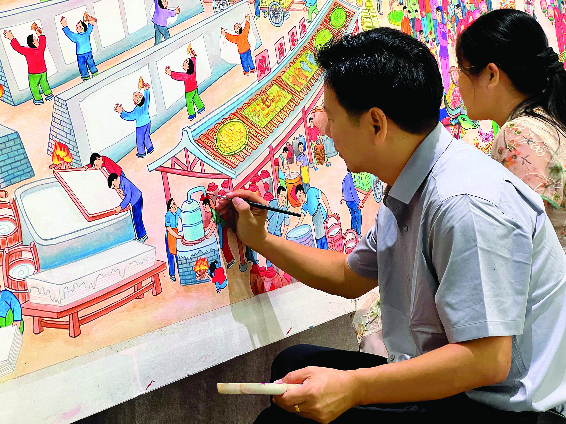 畫家正在創(chuàng)作龍門農(nóng)民畫;葜萑請(bào)記者黃宇翔 攝