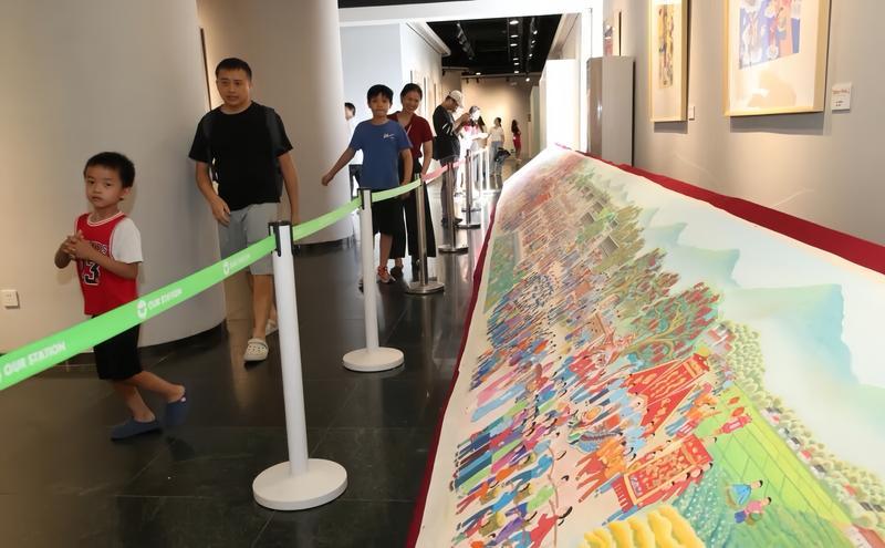 展廳內(nèi),一幅長13米、寬1米的農(nóng)民畫《非遺里的龍門》吸引市民紛紛駐足拍照,感嘆其創(chuàng)作之精妙、內(nèi)容之豐富。這幅由龍門縣文化廣電旅游體育局策劃出品,黃偉平、廖錦鋒、梁彩歡、駱雪芳、羅秀芳、劉少夏、蘇曉明7位畫家歷時(shí)半年創(chuàng)作的作品在本次展覽中首度公開展出。舞火狗、做棚、上燈、虎頭花燈、醒獅、春牛舞、舞龍、織帶仔、造紙、盒籮、釀酒、米餅、胡須雞、大籠糍、西溪筍等40多項(xiàng)非遺瑰寶躍然紙上,人物神態(tài)栩栩如生,四時(shí)風(fēng)俗熱鬧喜慶,山川景致清新宜人,堪稱龍門農(nóng)民畫版的“清明上河圖”。