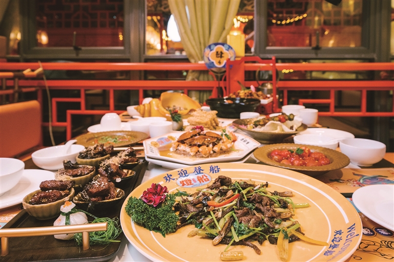 一封“圣旨”,暗含玄機。蟹肉咸蛋肉餅、玉環(huán)炒脆肉、鹵汁五頭鮑、涼拌鯊魚皮、將軍海膽炒飯……一道道美味佳肴隨著“圣旨”展開,這一份獨特的菜單之內是伴隨著一代惠州人成長的專屬于喜碧海鮮的好味道;葜菅顼嬑幕c大唐文化在此深度融合,如金風玉露相逢,讓“燈船”大唐不夜城在“好玩”之余更“好食”。