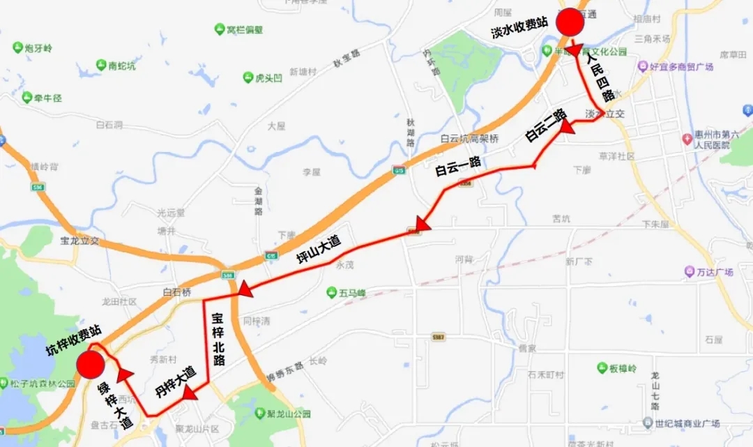 期間,原經(jīng)淡水收費站深圳方向上行匝道上高速的車輛,可繞行人民四路→白云二路→白云一路→坪山大道→寶梓北路→丹梓大道→綠梓大道→坑梓收費站上高速。