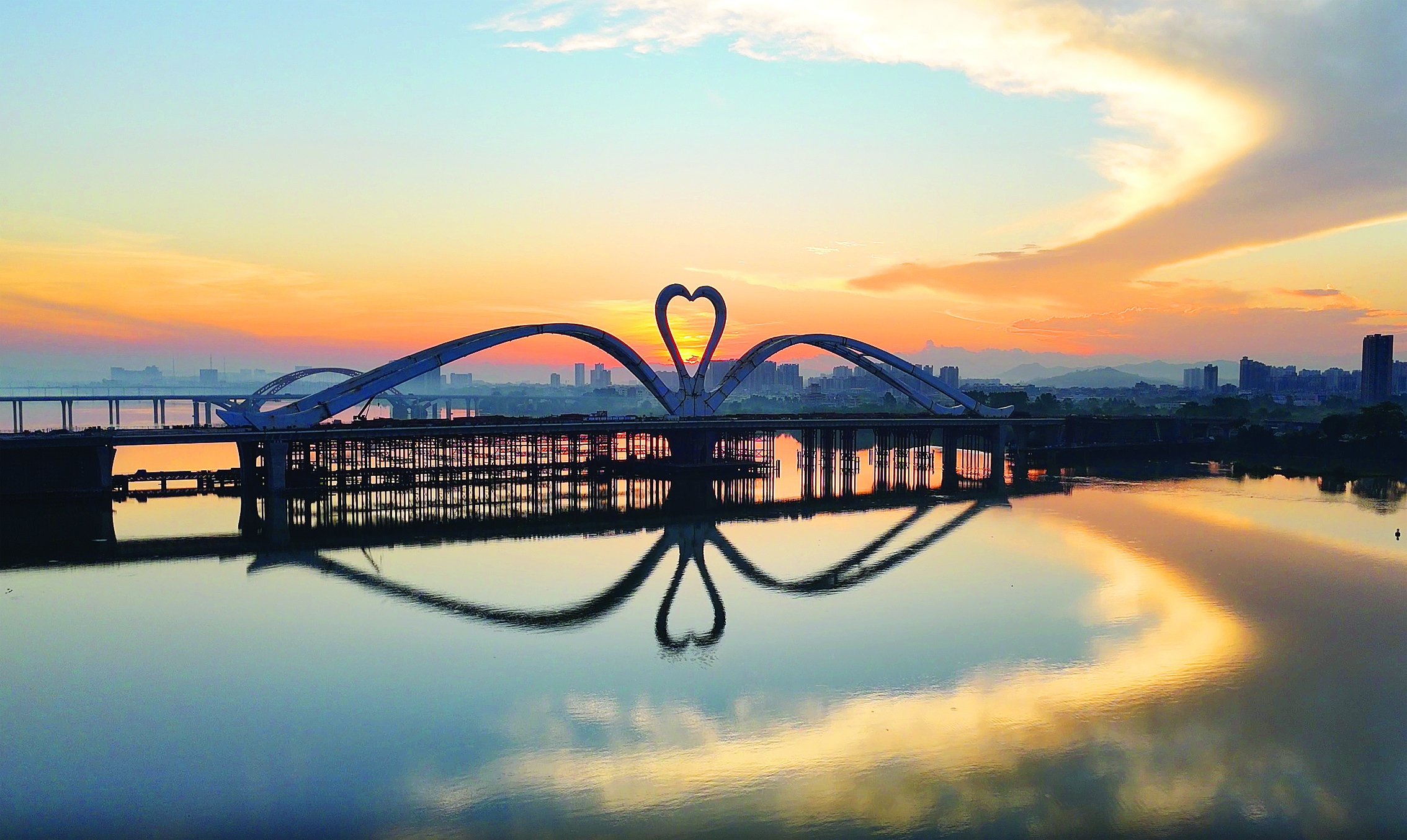 在惠州,連大橋都是愛你的形狀,這是屬于惠州人的浪漫。清晨,朝霞染紅天空,惠州鵝城大橋“雙鵝”相依,修長的“鵝頸”拼成一個愛心形狀,美不勝收。鵝城大橋以東江之“水”、惠州之“鵝”為主要元素進行演繹設(shè)計,藝術(shù)造型蘊含“天鵝引頸高歌”的美好寓意。鵝城大橋計劃年內(nèi)建成通車。惠州日報記者王建橋 攝