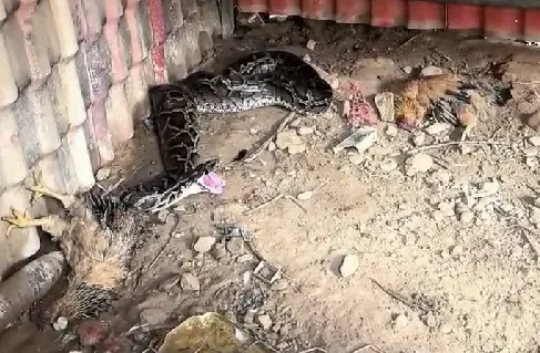 現(xiàn)場看到蟒蛇已經(jīng)將4只母雞咬死,