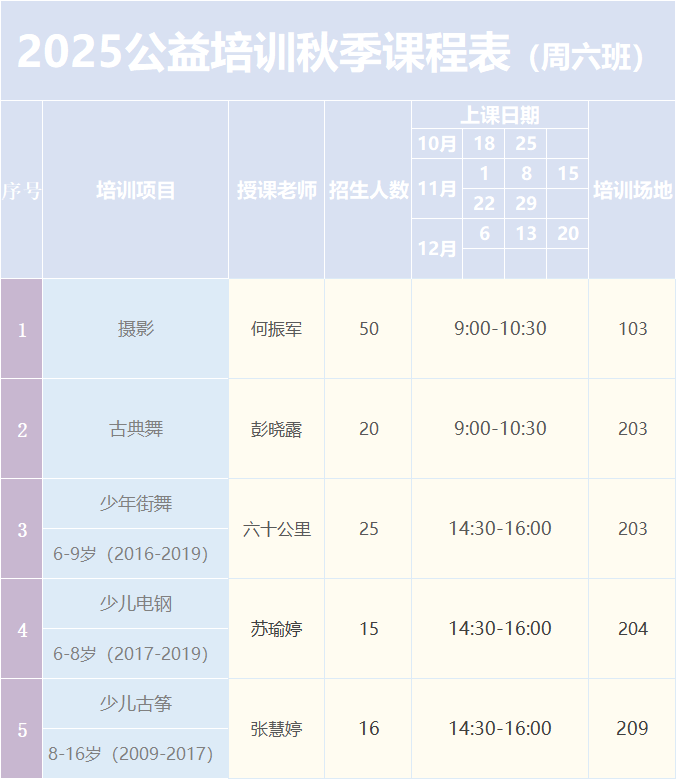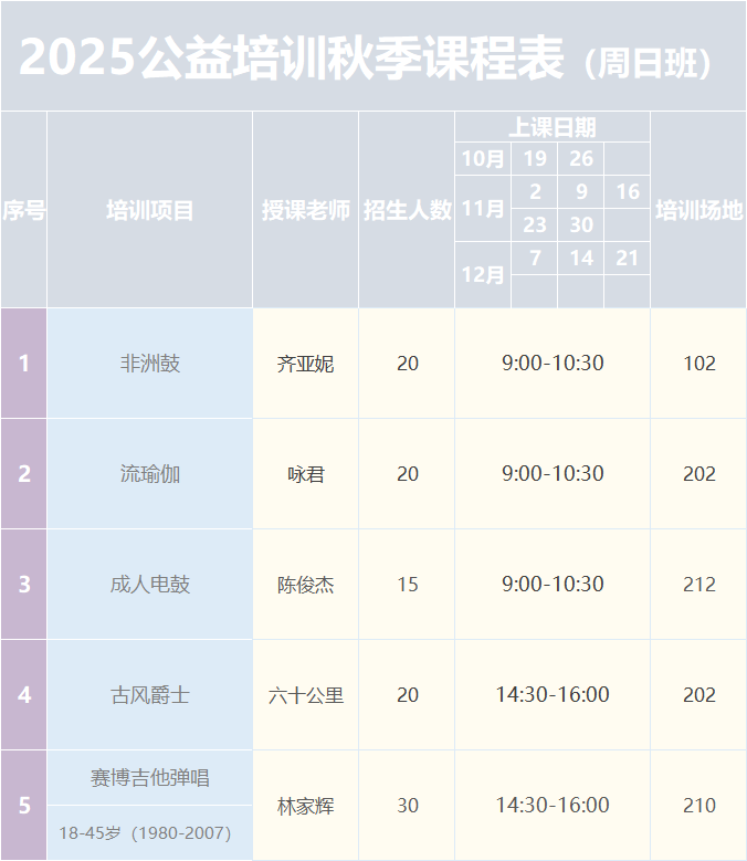 此次培訓班課程設(shè)置多樣,既有適合青少年學習的少兒街舞、古箏等,也有面向成人的攝影、吉他彈唱等藝術(shù)課程,滿足不同年齡段市民的文化需求。所有課程均免費開放,但名額有限,采取線上報名、后臺隨機抽簽的方式錄取。中簽者將收到短信及“文惠圈”站內(nèi)信通知,并于9月20日至21日(10:00-16:00)前往惠州市文化館辦理入學登記。