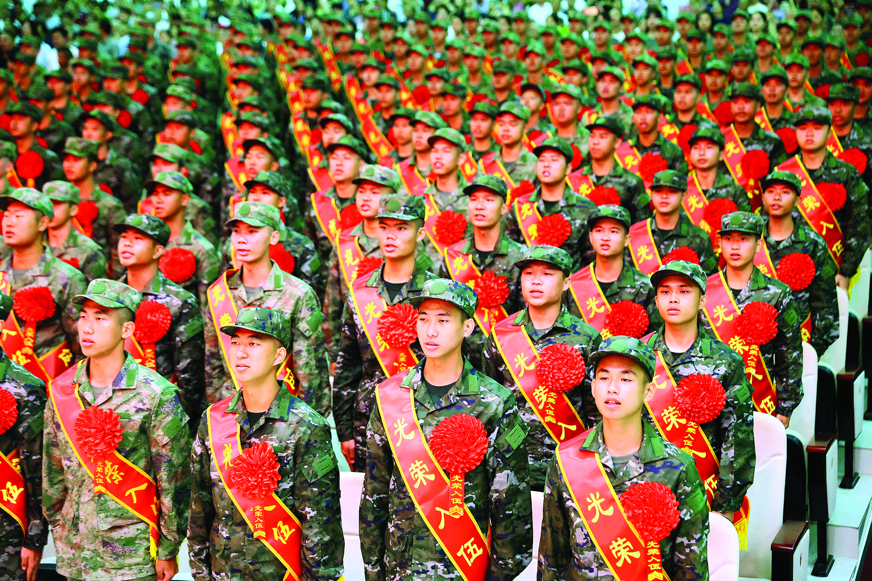 身披綬帶、胸戴紅花的新兵精神抖擻、英姿颯爽。