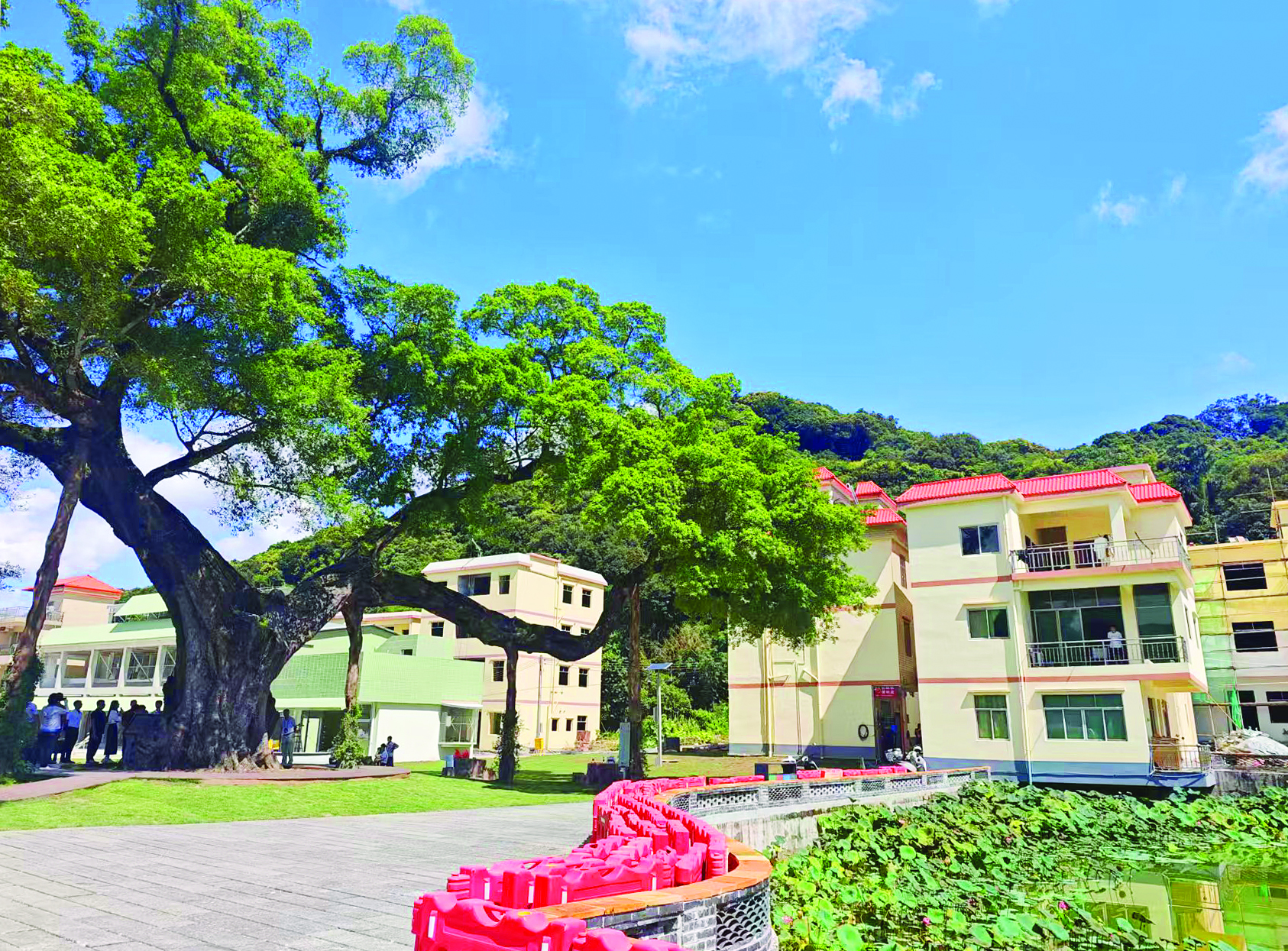 在龍門縣麻榨鎮(zhèn)中心村,黃墻橙瓦的驛站與千年榕樹相映成趣;葜萑請笥浾哂舞 攝