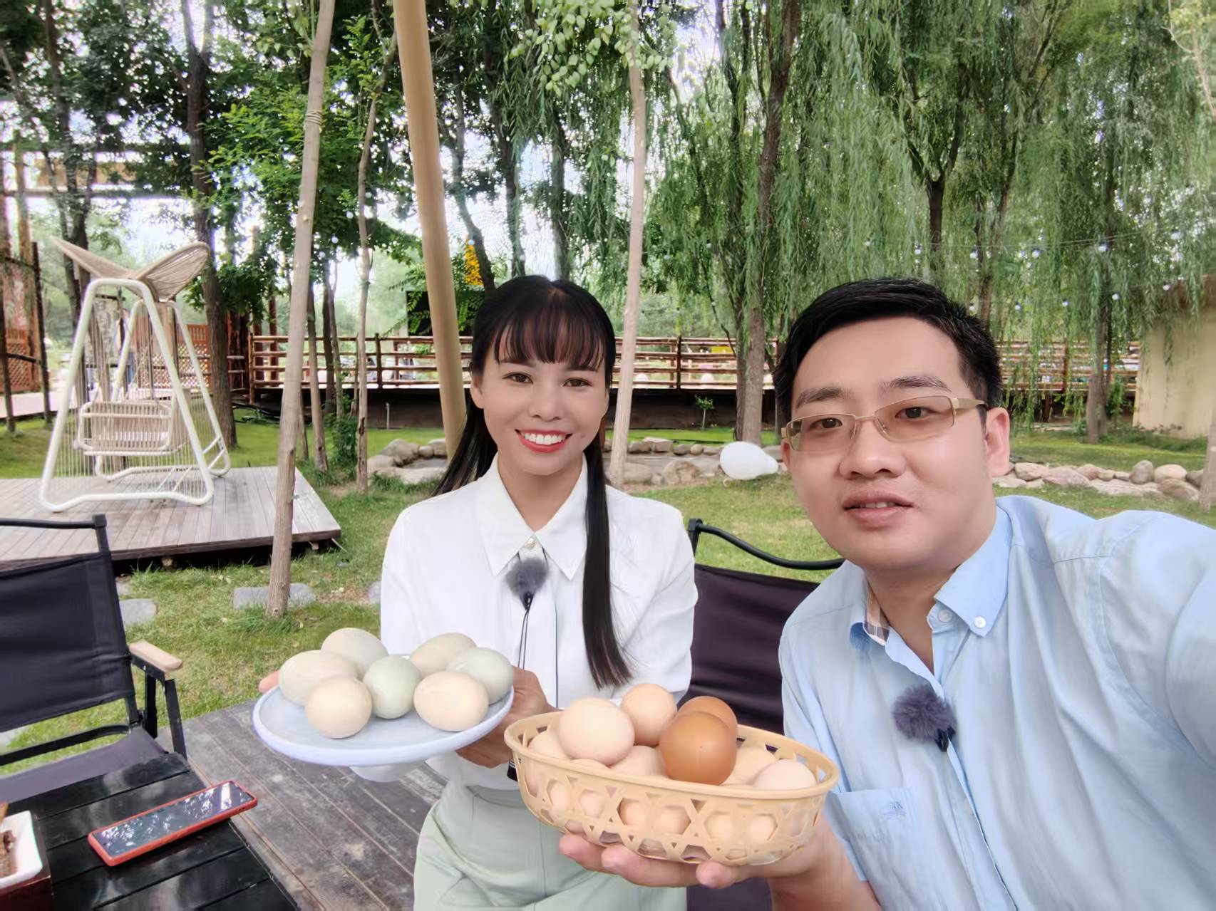 董平天(右)帶著惠州生產(chǎn)的鮮雞蛋與馬鈴薯蛋糕登上全國舞臺(tái)展示給全國觀眾。