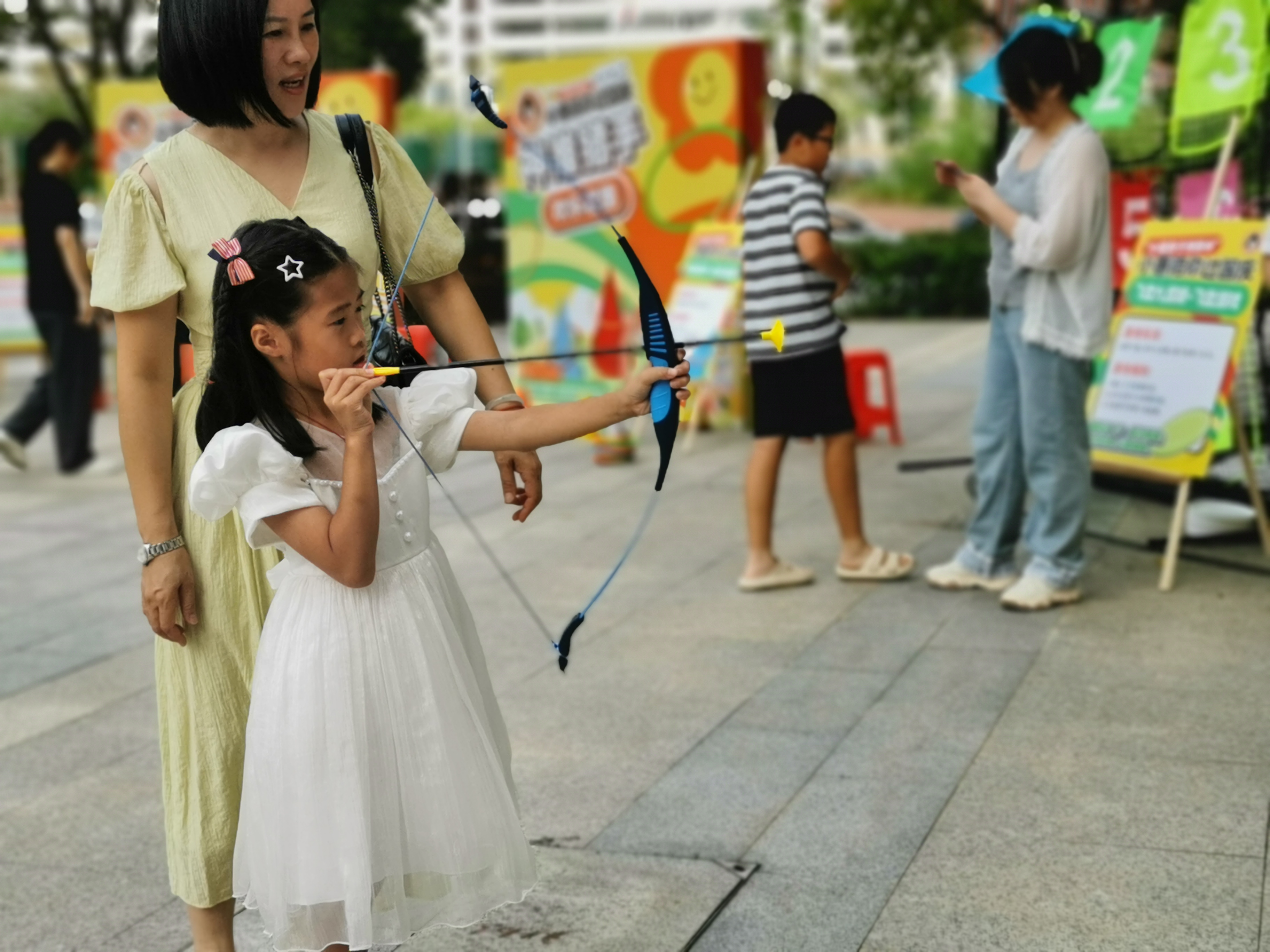 無論主會(huì)場(chǎng)還是分會(huì)場(chǎng),闖關(guān)游戲區(qū)都是孩子們的“歡樂戰(zhàn)場(chǎng)”!鞍俨酱睢鄙浼螒蚯埃∽x者們端著玩具弓箭,瞄準(zhǔn)靶心調(diào)整姿勢(shì);“投壺大挑戰(zhàn)”展位前,大家模仿古人站姿投擲箭矢,中靶時(shí)的歡呼聲接連不斷。“集齊6個(gè)印章就能抽獎(jiǎng),100%的中獎(jiǎng)率讓每個(gè)孩子都滿意而歸。公益集市上,小惠主題文創(chuàng)筆、非遺紙鳶、烤腸、缽仔糕、無人機(jī)科普.....多個(gè)展位一字排開,孩子吃著美味小吃,體驗(yàn)有趣的無人機(jī),超級(jí)開心。