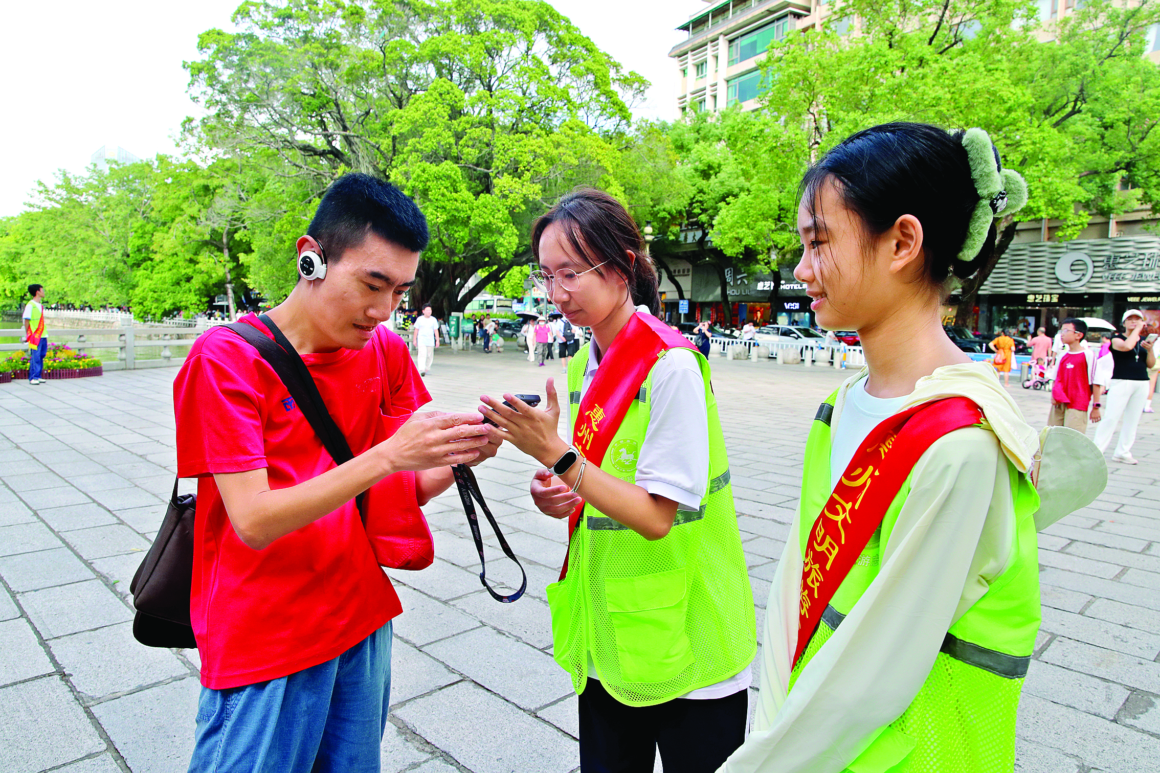 10月5日,惠州文明旅游志愿者在西湖景區(qū)服務(wù)游客。 惠州日?qǐng)?bào)記者鐘暢新 攝