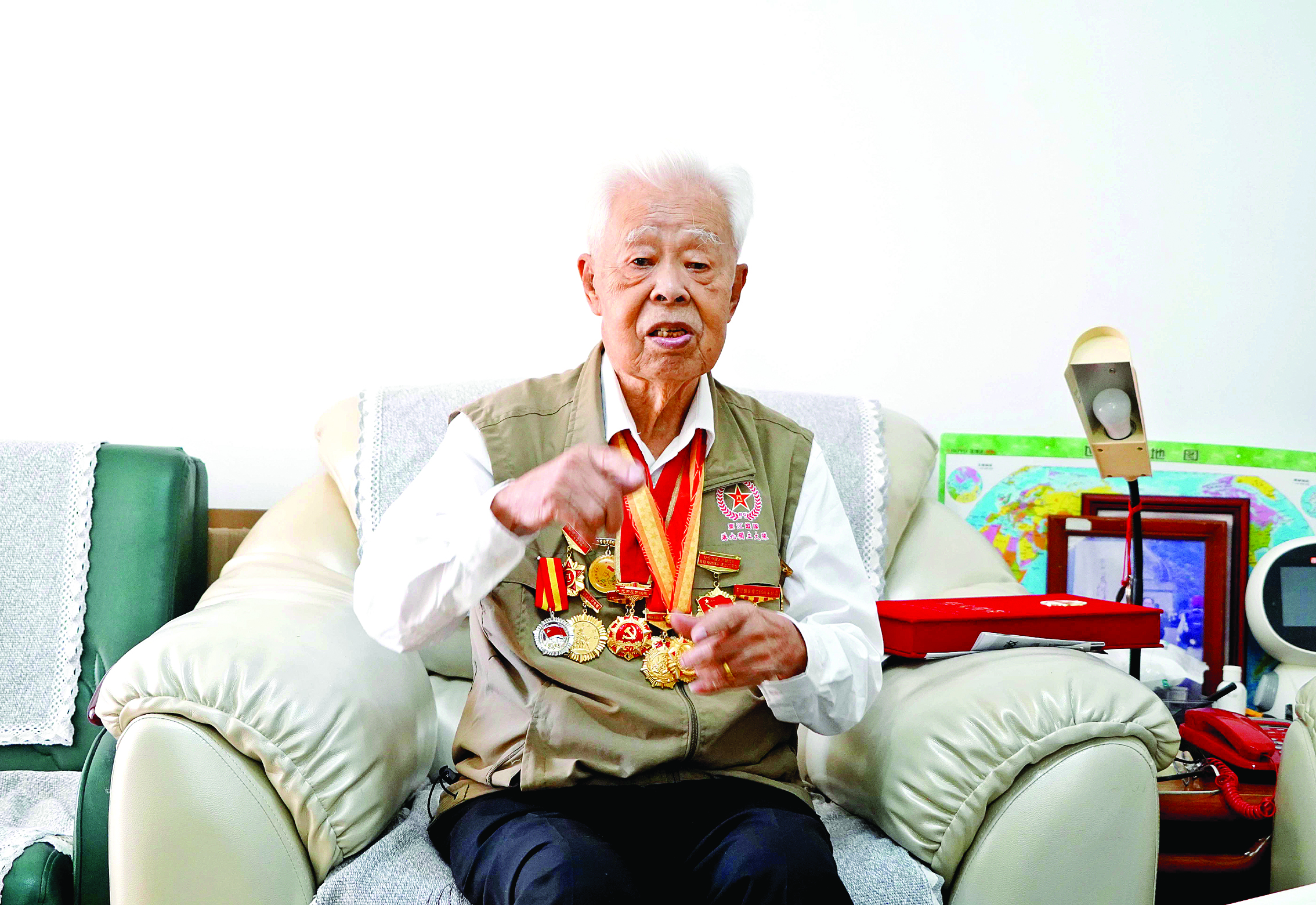 腰板挺直、精神矍鑠,初見羅競輝,94歲的他面帶微笑,精氣神很足。他站立在家門口,與到訪者一一握手、問好,胸前一枚枚勛章熠熠生輝,讓人仿佛看到當(dāng)年那個(gè)在驚濤駭浪中,與日寇反復(fù)周旋的英勇少年。
