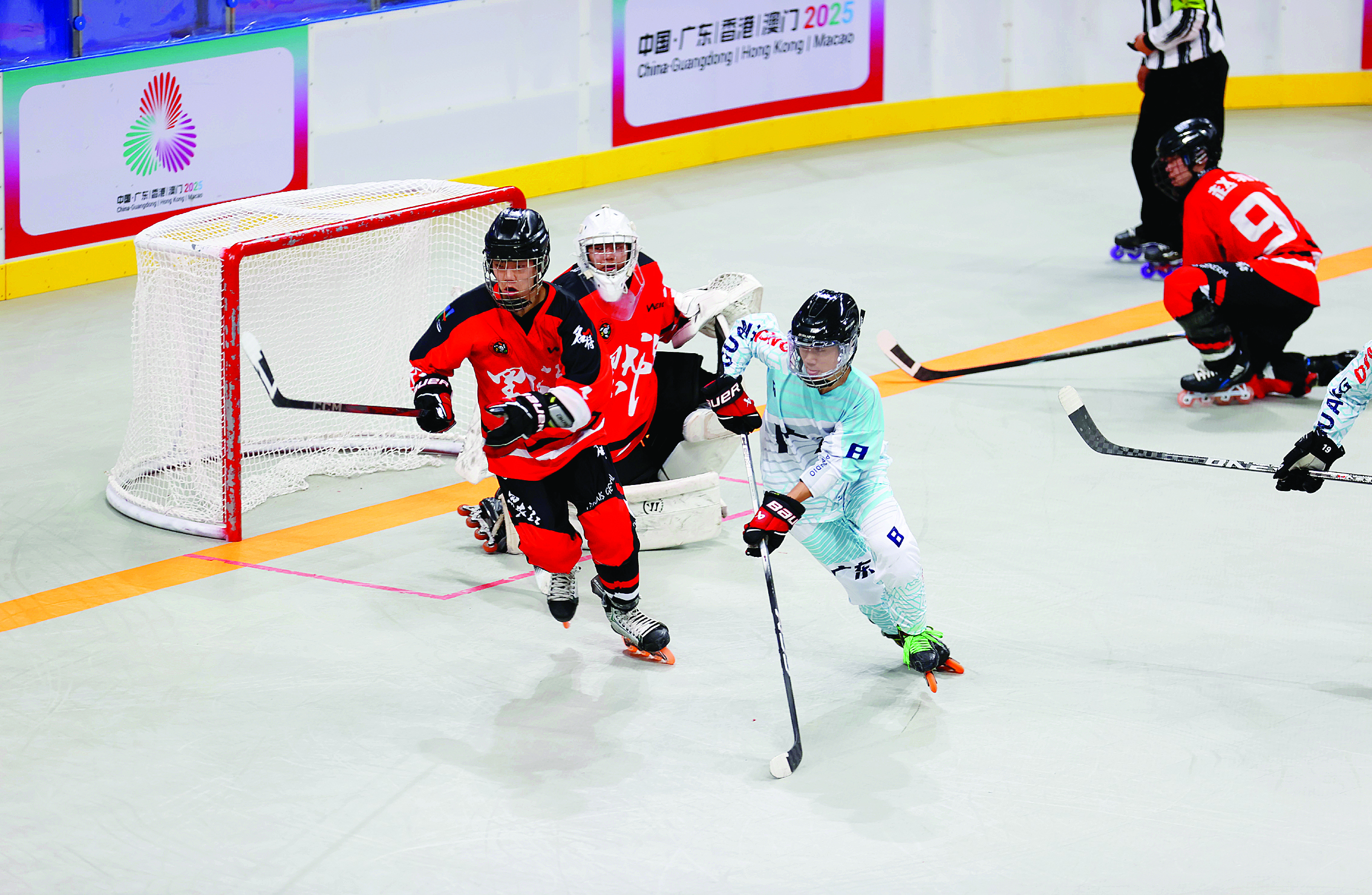 昨日的單排輪滑球比賽中,廣東男隊(藍(lán)方)4:1戰(zhàn)勝黑龍江男隊;葜萑請笥浾邨罱I(yè) 攝