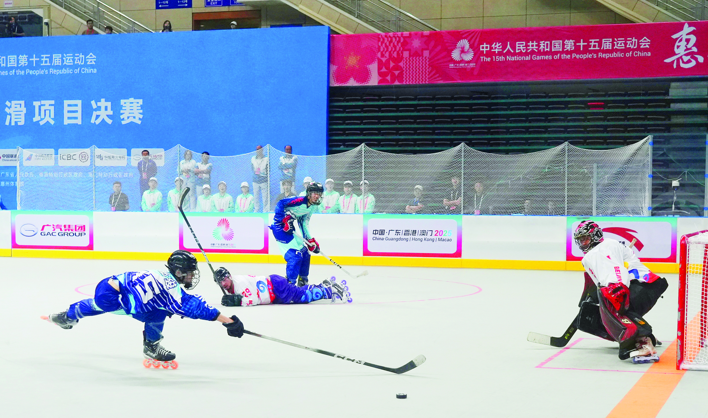 十五運(yùn)會(huì)群眾比賽單排輪滑球女子組銅牌爭奪戰(zhàn)在惠州體育館上演驚險(xiǎn)一幕——廣東隊(duì)隊(duì)員王潔雯在終場哨響前壓秒進(jìn)球,將比分鎖定為4:1,助力廣東隊(duì)力克上海隊(duì)摘得銅牌。