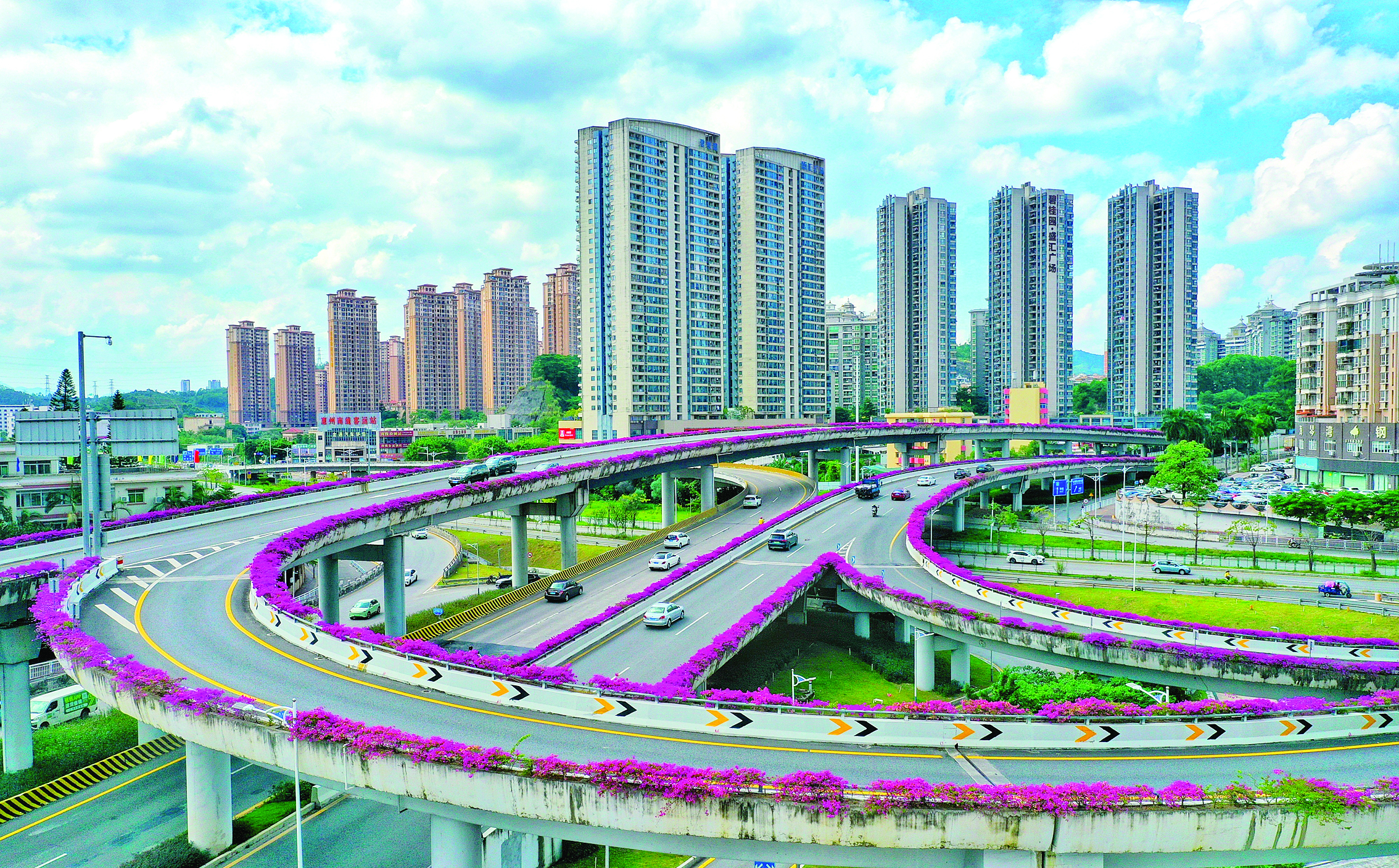記者在現(xiàn)場(chǎng)看到,連綿的簕杜鵑沿立交橋護(hù)欄肆意舒展,紅色苞片層層疊疊,遠(yuǎn)觀如紅色彩綢纏繞橋面,從高空俯瞰,繁花串聯(lián)成線,形成一條蜿蜒的“花路”。駕車駛過橋面時(shí),車窗外的簕杜鵑隨風(fēng)搖曳,陽光灑在花瓣上泛著光澤,為城市增添了柔和浪漫的氣息。